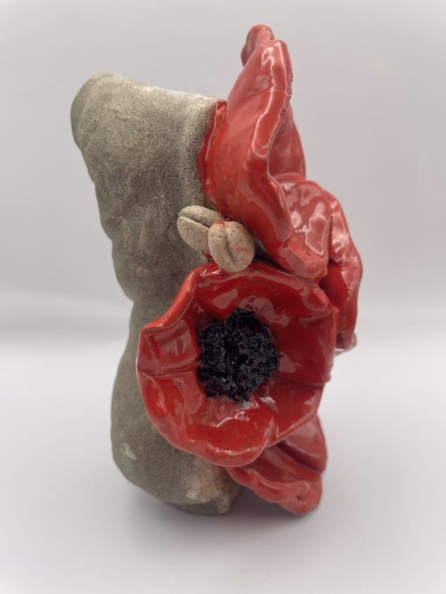 Hon är formad i naturlig lera, med en yta som känns rå, jordnära och ärlig. Kroppen bär spår av händerna som skapat henne, och den matta leran ger henne en stilla, organisk närvaro. De röda vallmoblommorna bryter igenom, nästan som om de växer direkt ur hennes form. Det är som om hon står mitt i övergången mellan stillhet och liv, mellan lera och blomma, mellan form och känsla.