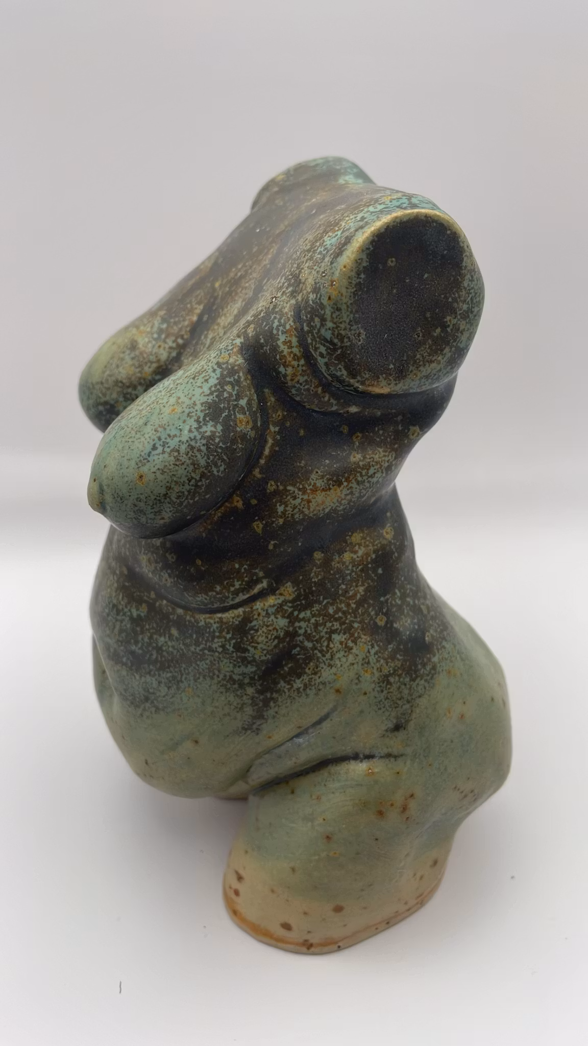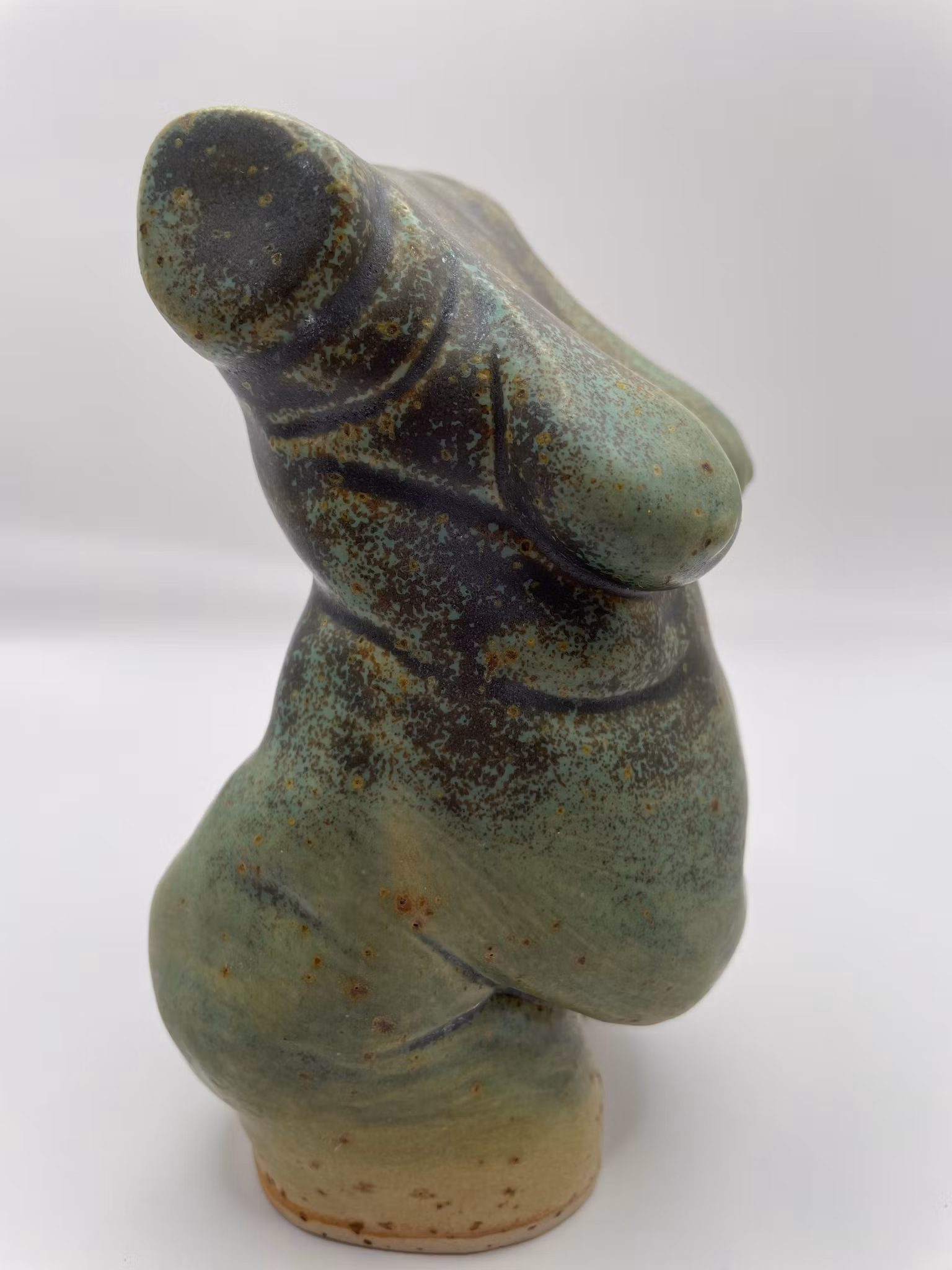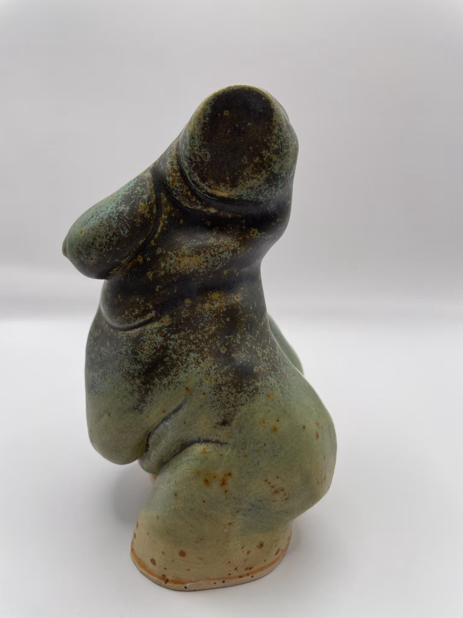 Hon har en fyllig, mjuk kropp där varje kurva känns självklar och närvarande. Den koppargröna glasyren ligger som ett levande lager över henne, murrig och djup, med skiftningar som rör sig längs formen som rinnande ljus. Färgen framhäver hennes volym och ger henne en känsla av värme och tyngd. Det är en kropp som bär både jord och metall, både stillhet och flöde, som om hon formats av naturens egna element.