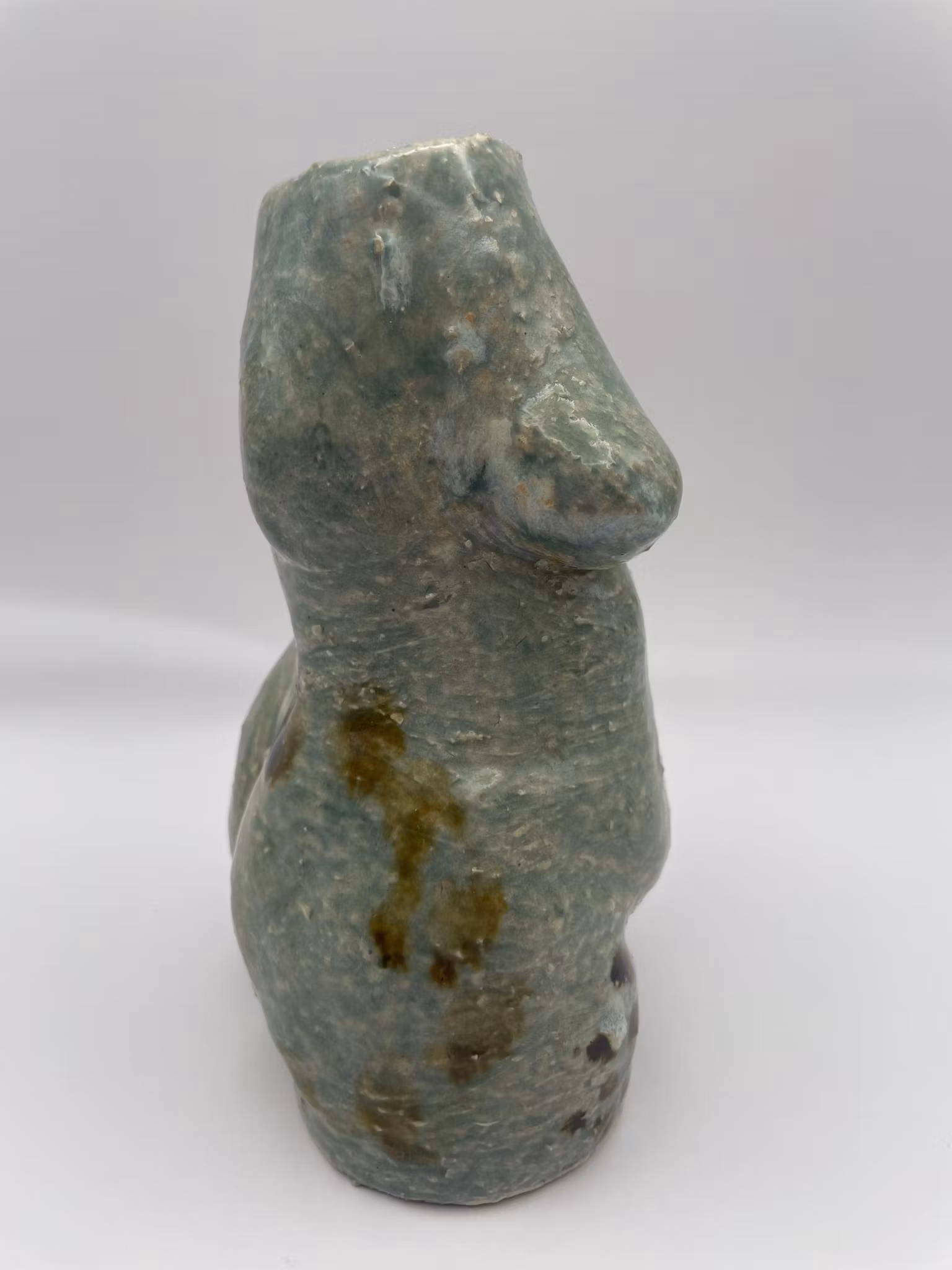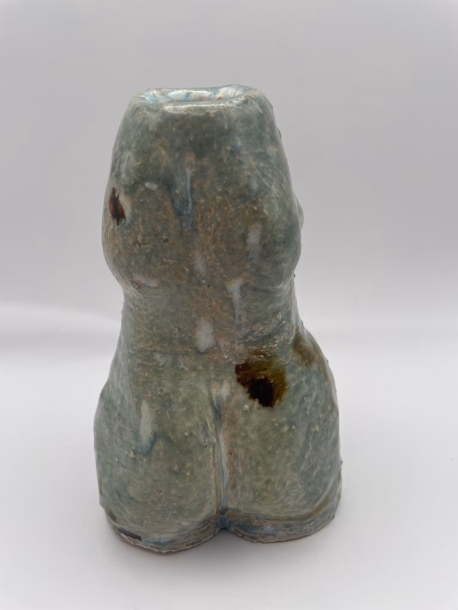 En vas formad som en kvinnokropp med transparentare glasyr där leran skiner fram samt lerans struktur. Det är något harmoniskt med denna vas och den gjorde sig väldigt fin med exemplet som på bilden.