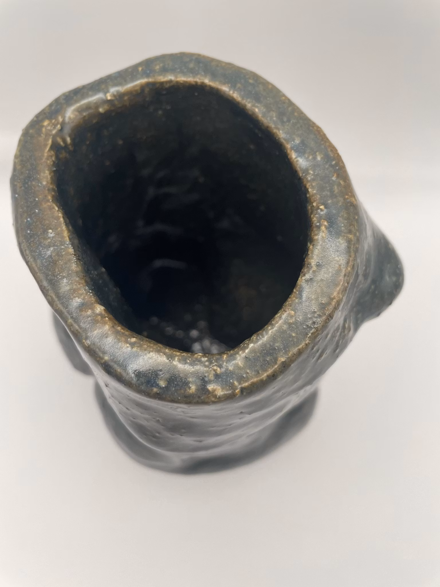 Den mörkblå ytan ger vasen ett djup som påminner om hav eller natt. Färgen skiftar beroende på ljuset och framhäver de organiska spåren i leran, vilket gör att vasen känns både rå och elegant. Den bär en känsla av stilla rörelse, som om blått vatten eller skugga har fastnat i formen. Persomliogen tror jag den också skulle vara ursnygg som kruka med palettblad i sig!