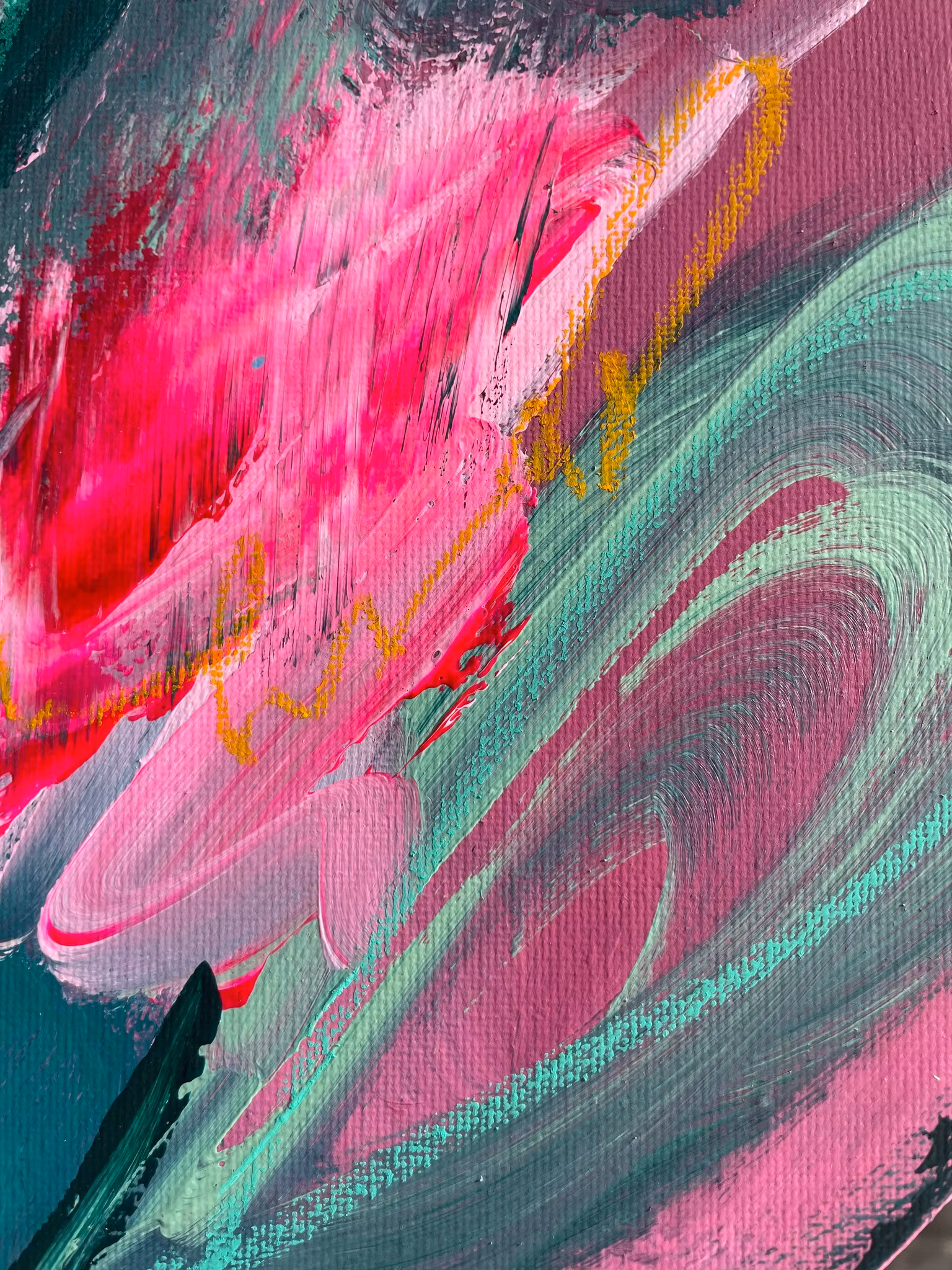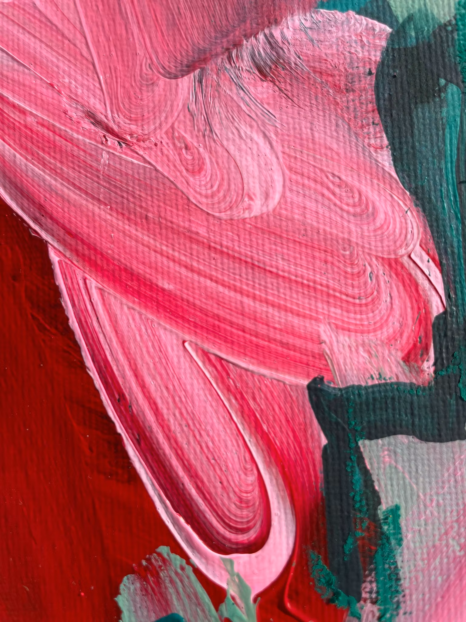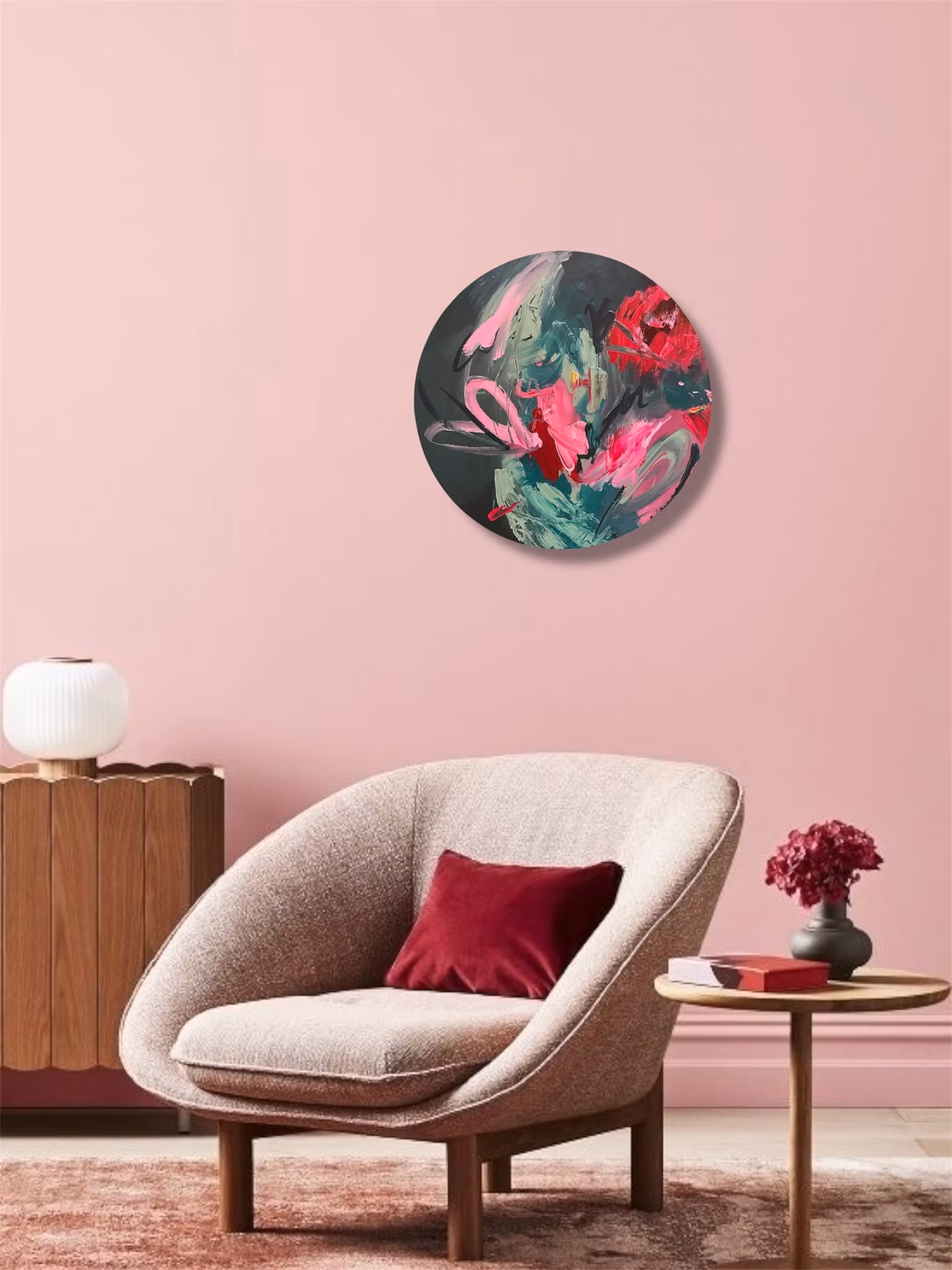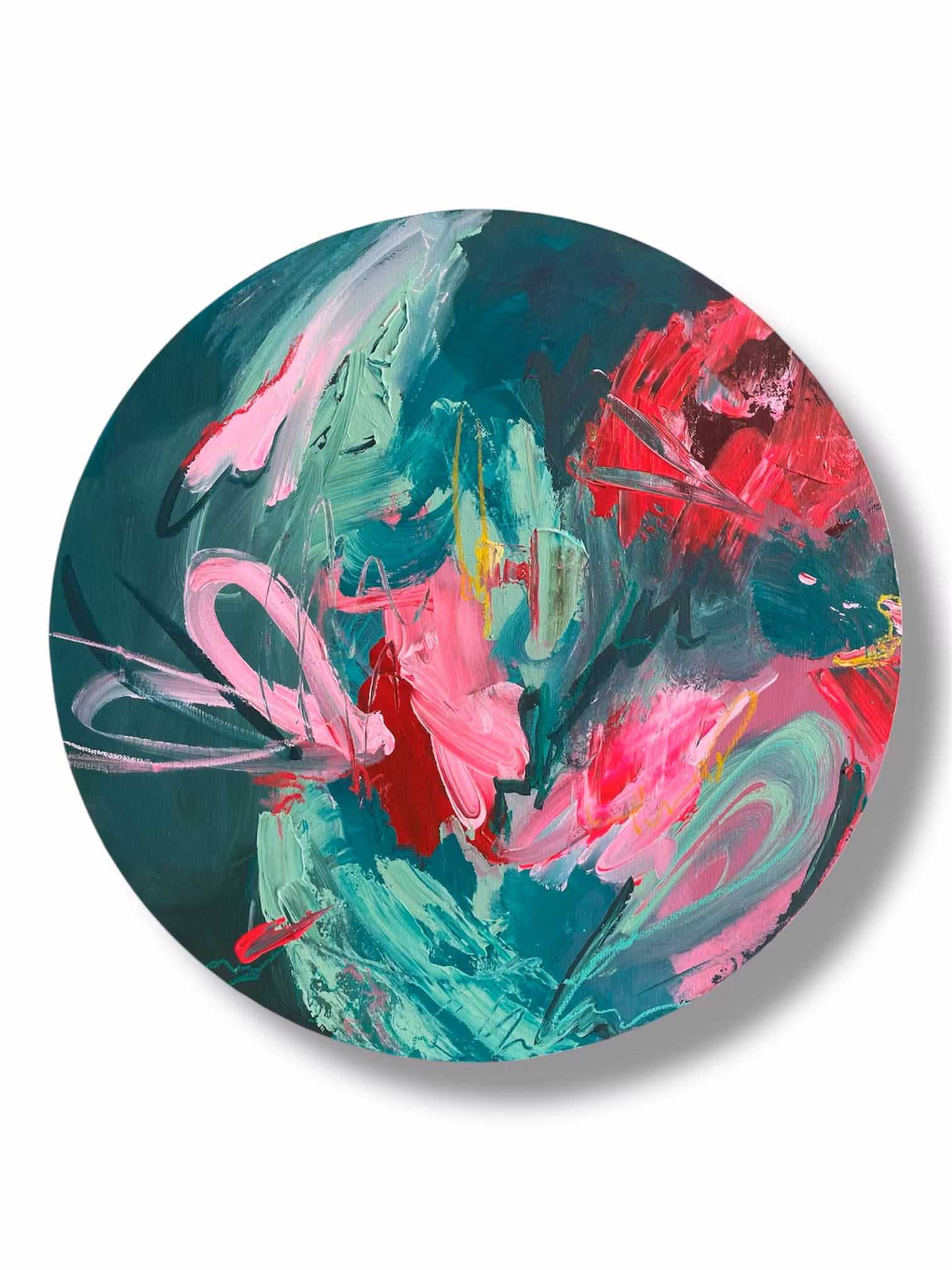 Rundcanvas i original med ett abstrakt motiv. Blandning av gröna, röda och rosa nyanser. Få detaljer i gul. Skapad 2026Signerad på baksidan