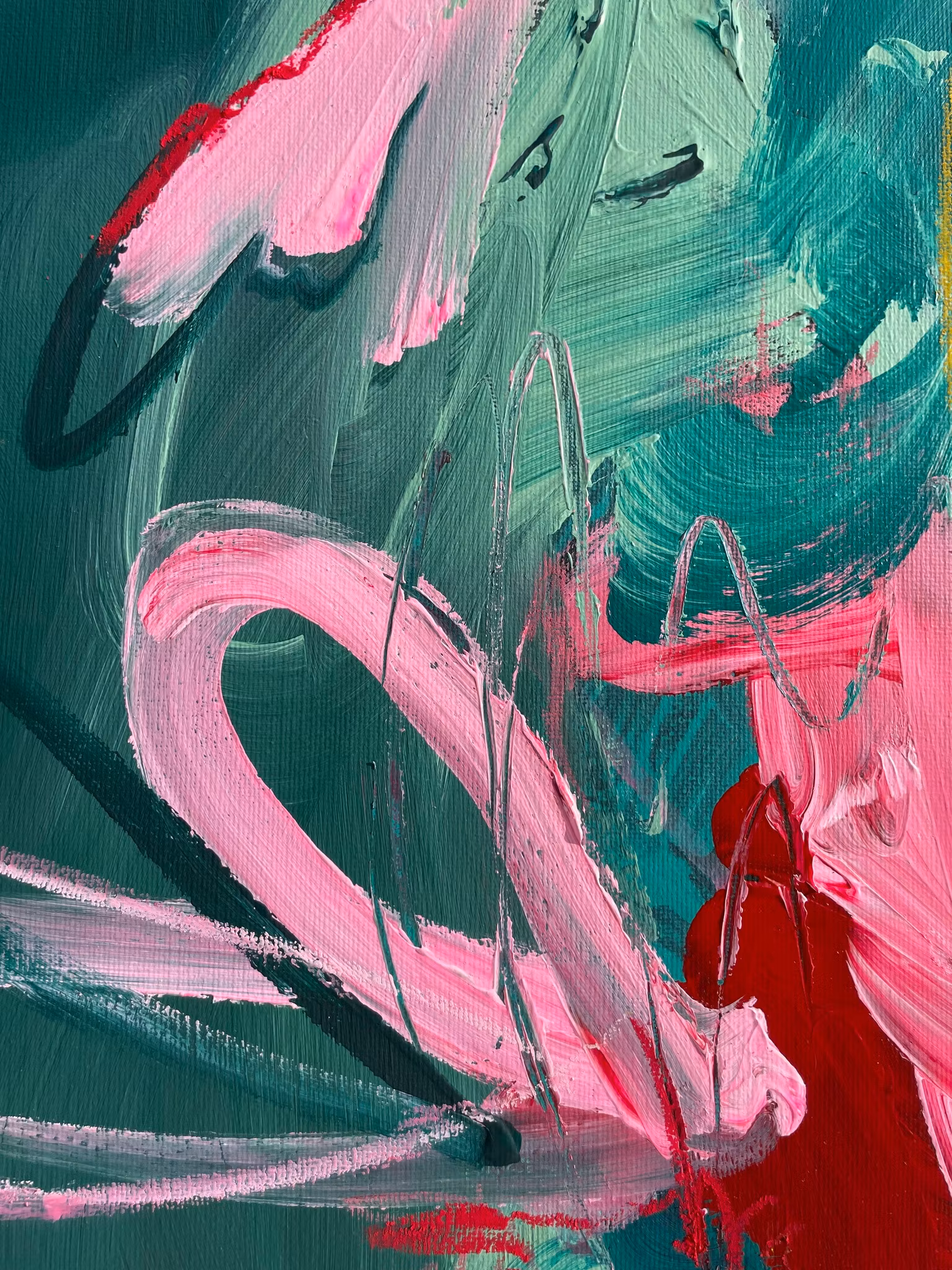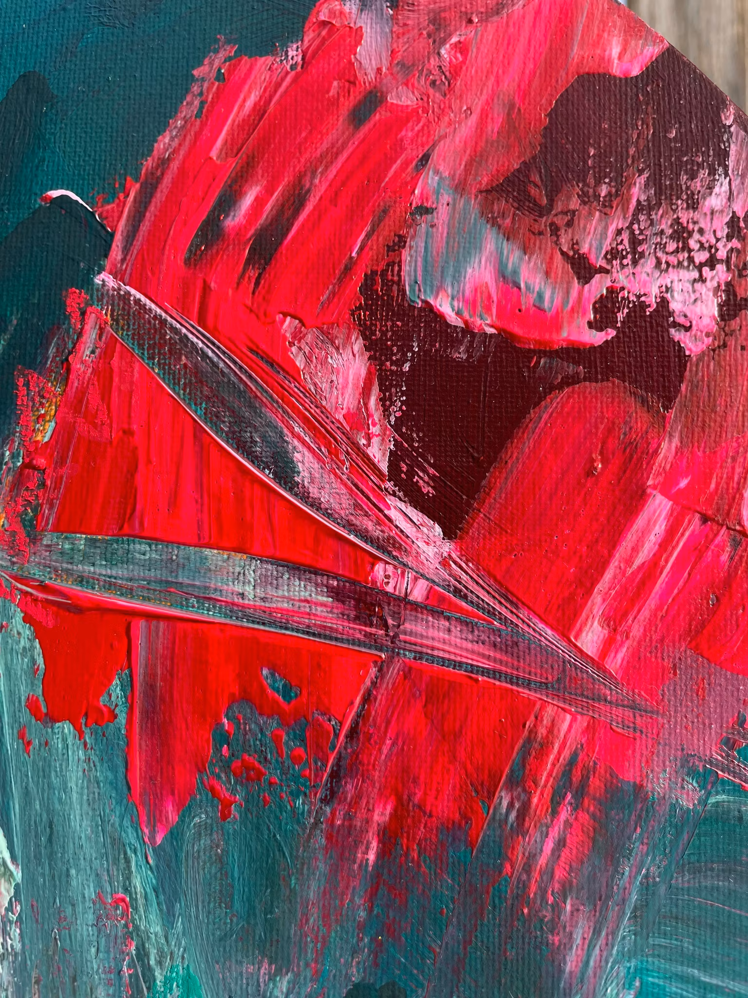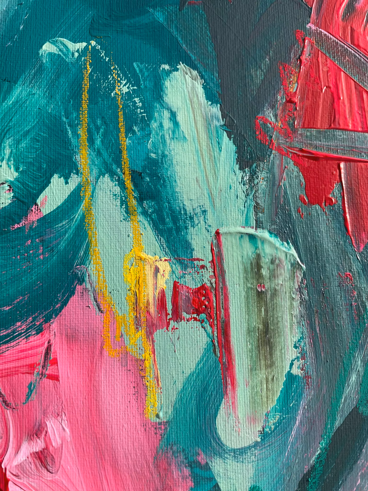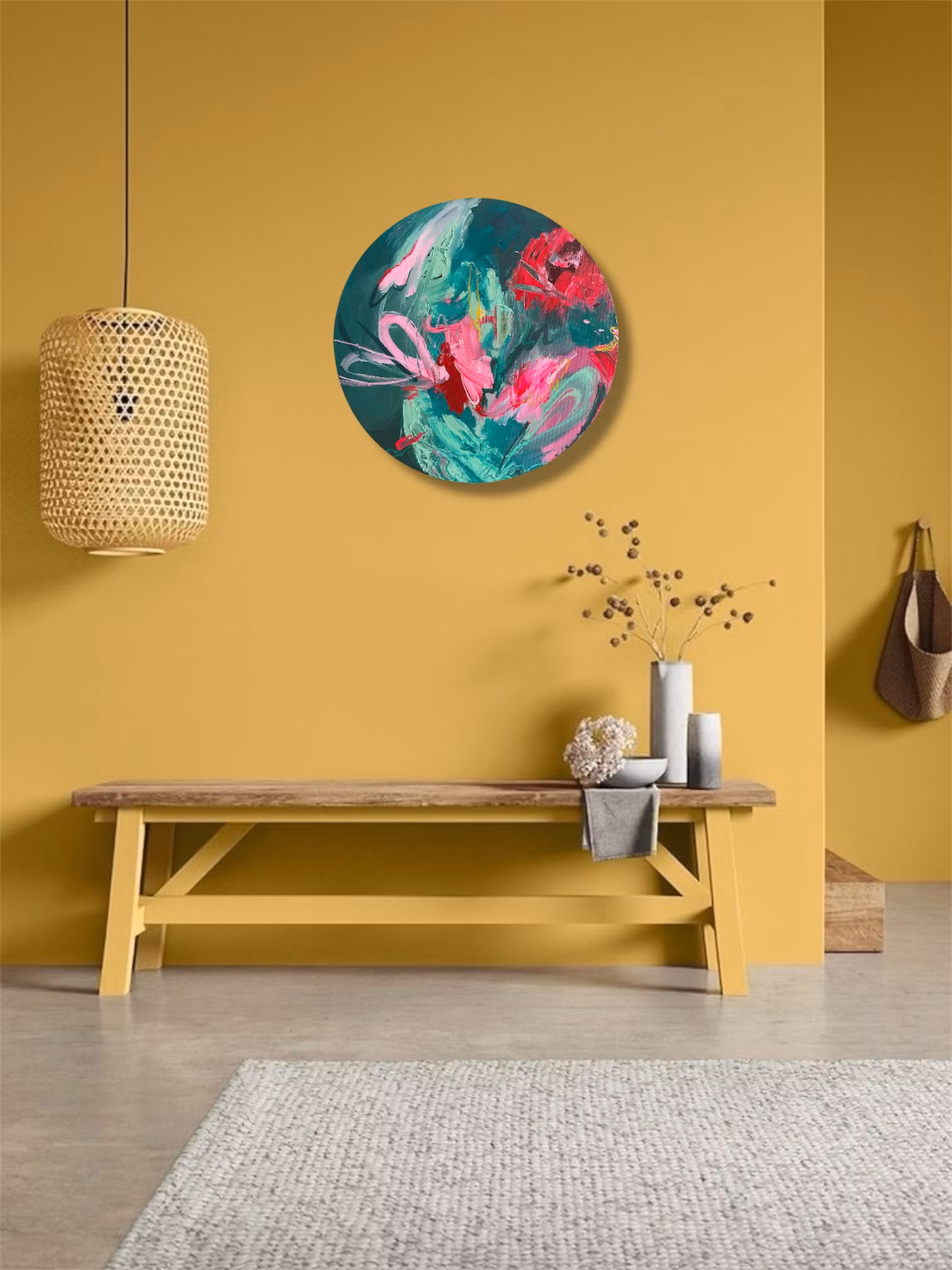 Rundcanvas i original med ett abstrakt motiv. Blandning av gröna, röda och rosa nyanser. Få detaljer i gul. Skapad 2026Signerad på baksidan