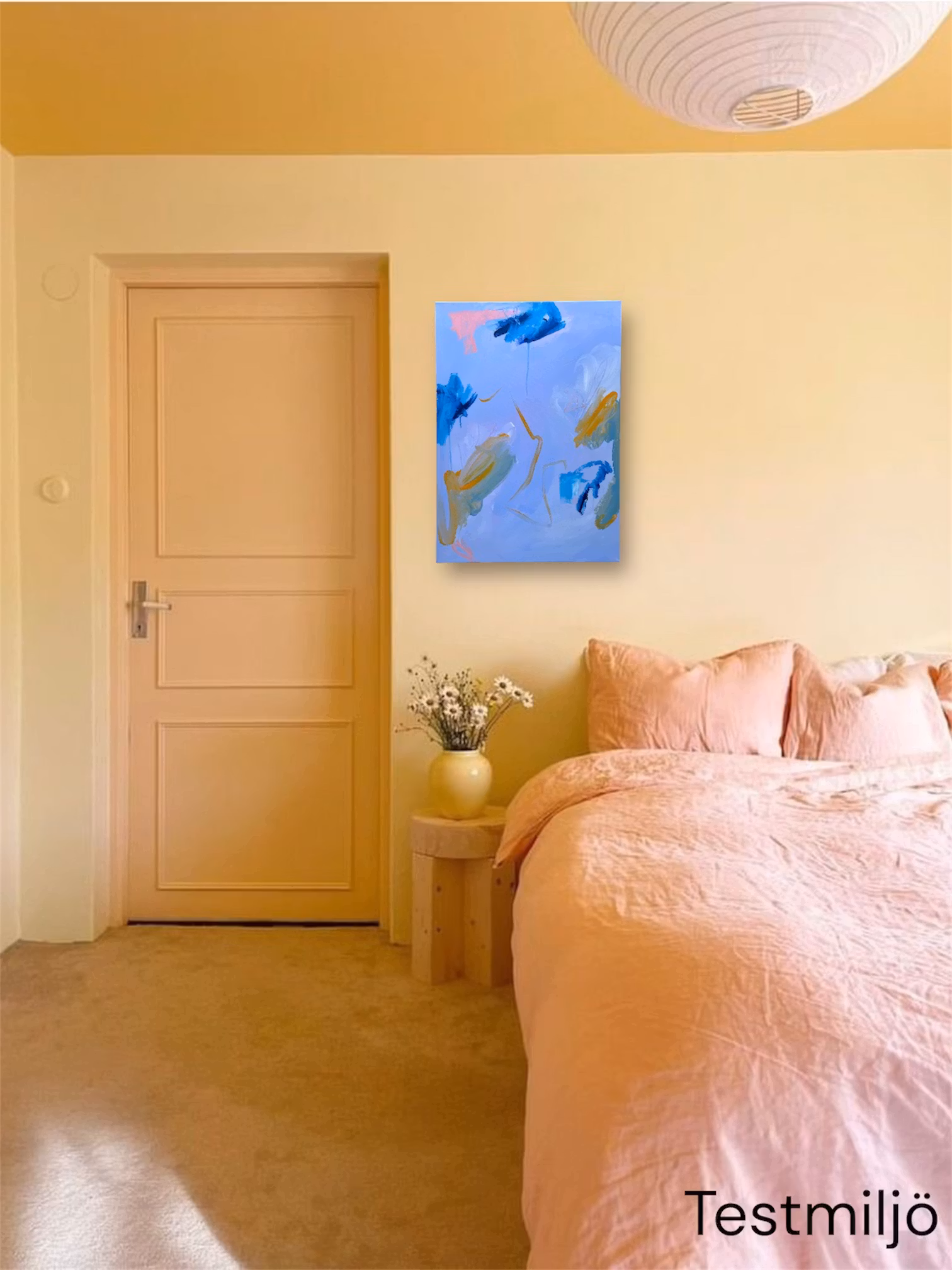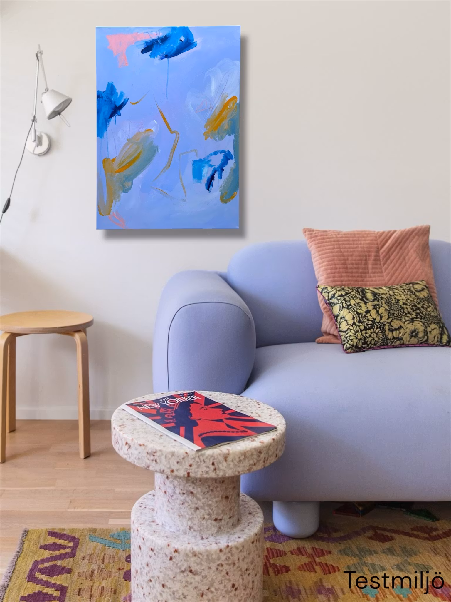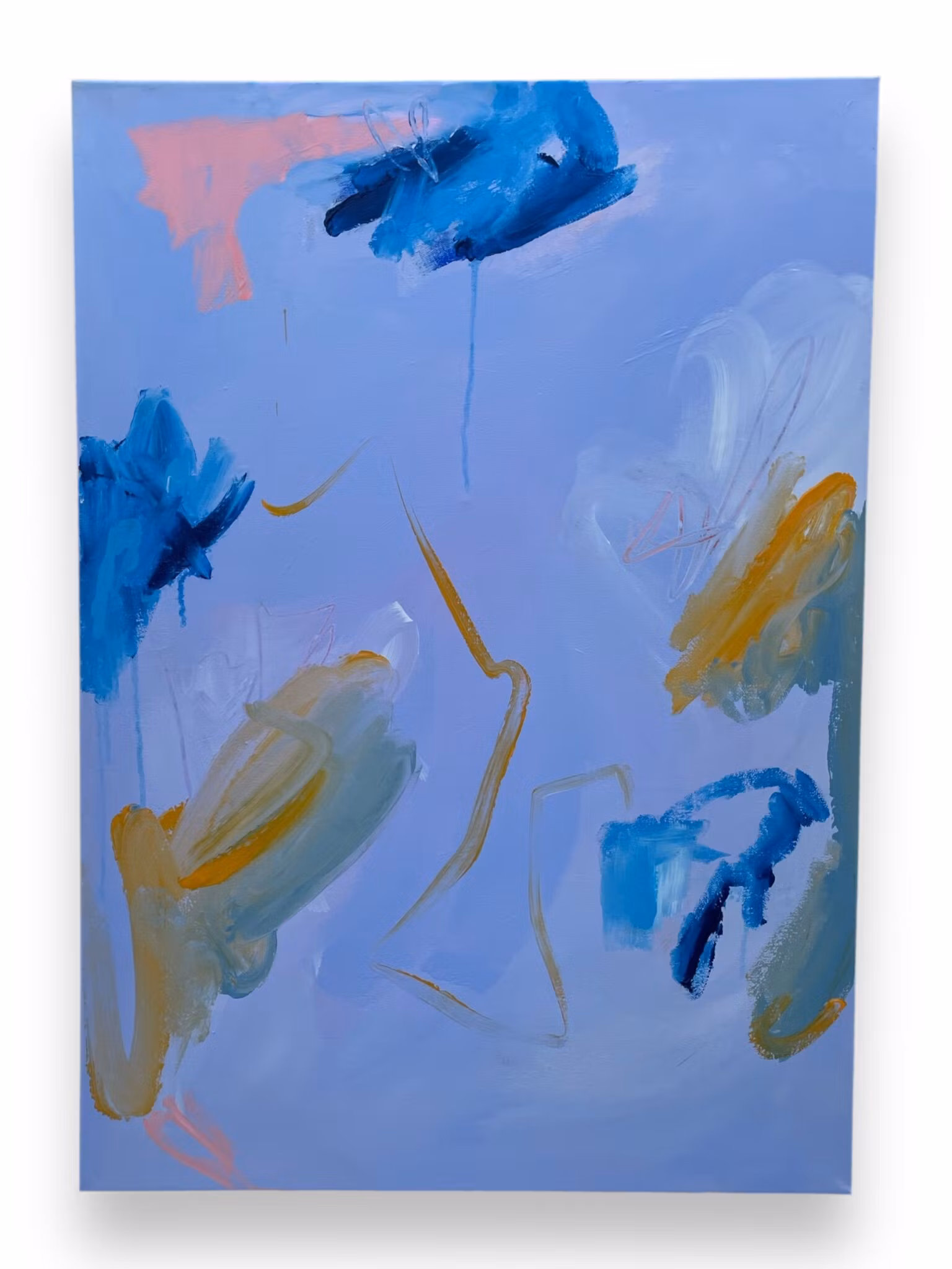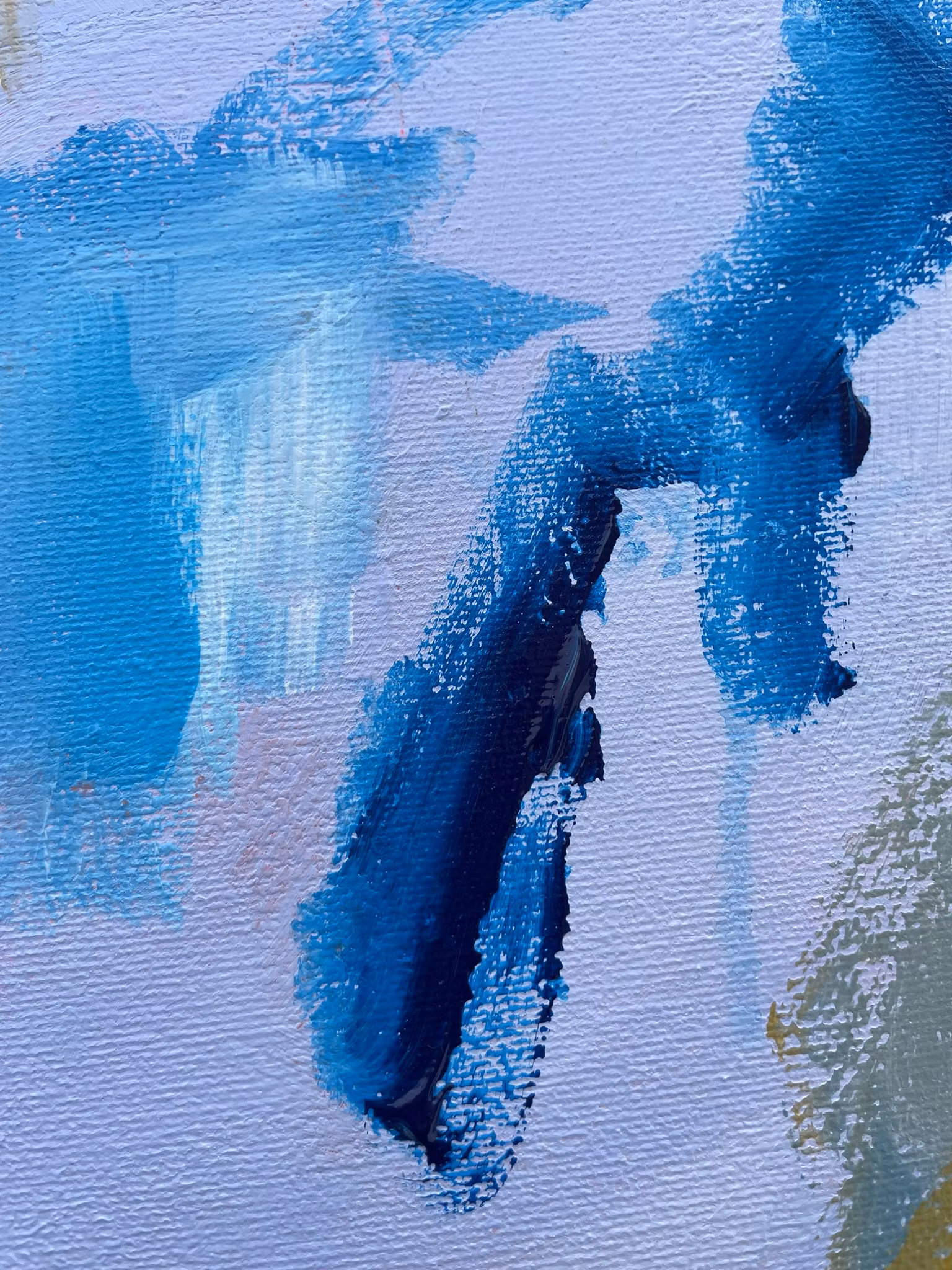 Blålila bas, även kallad wisteria. Detaljer i djupblå, senapsgul och kall grön främst i kanternaI abstrakta tavlor gömmer det sig olika saker då tolkningen är subjektiv. För mig dolde det sig lite fiskar och tång.50x70