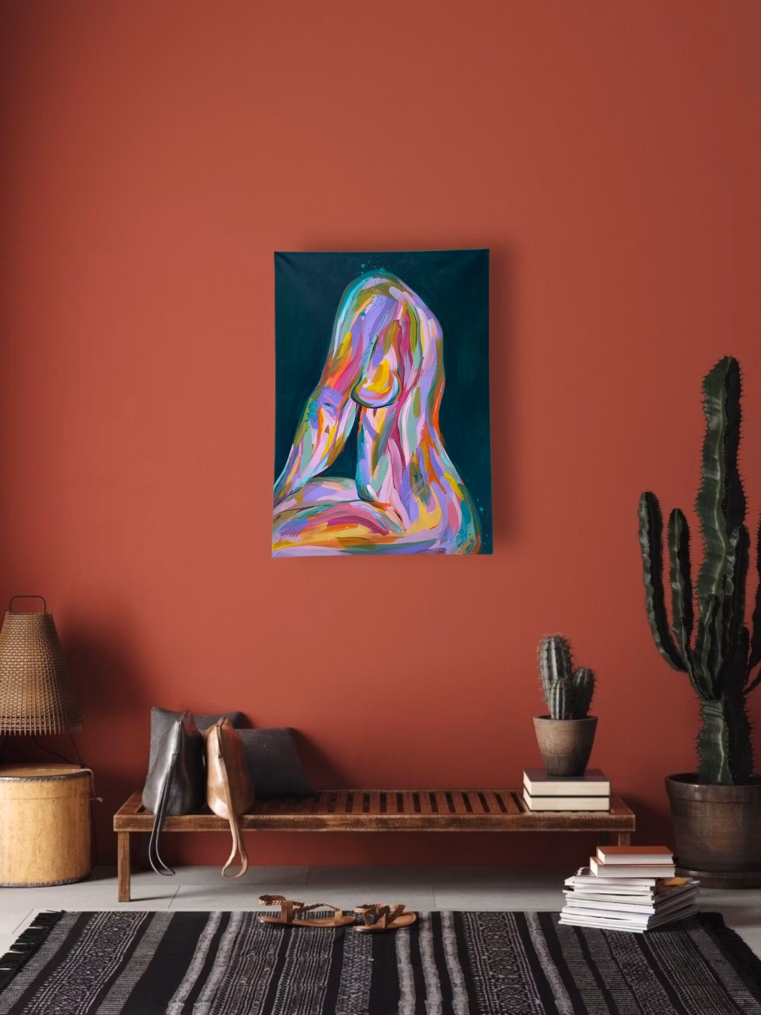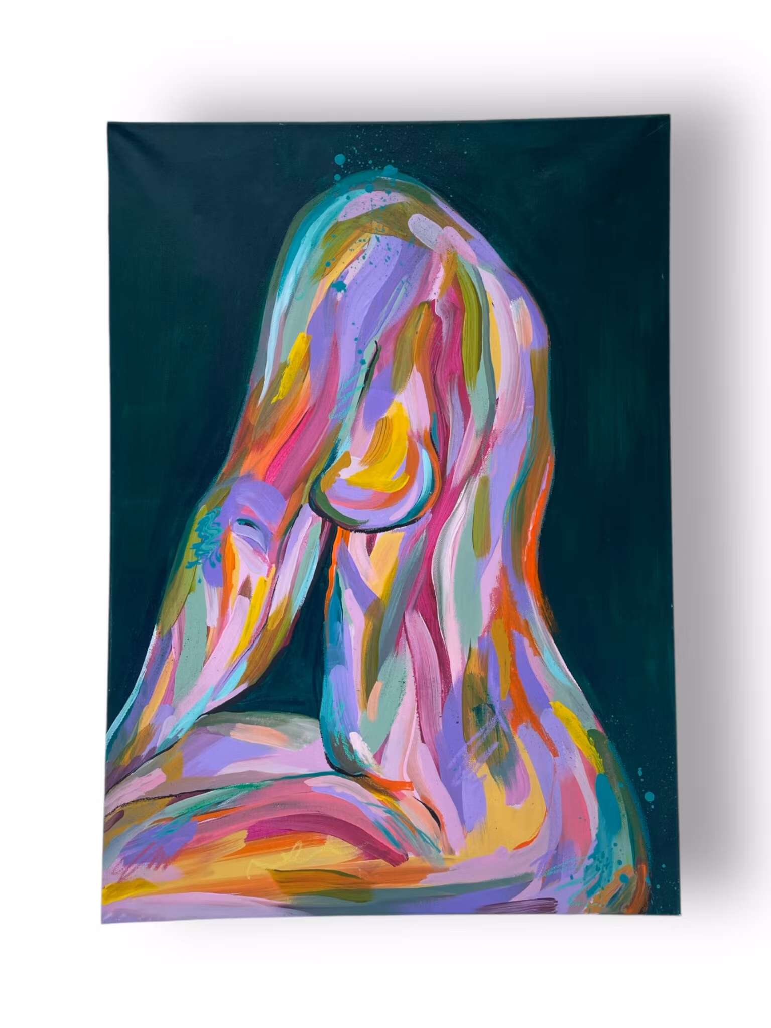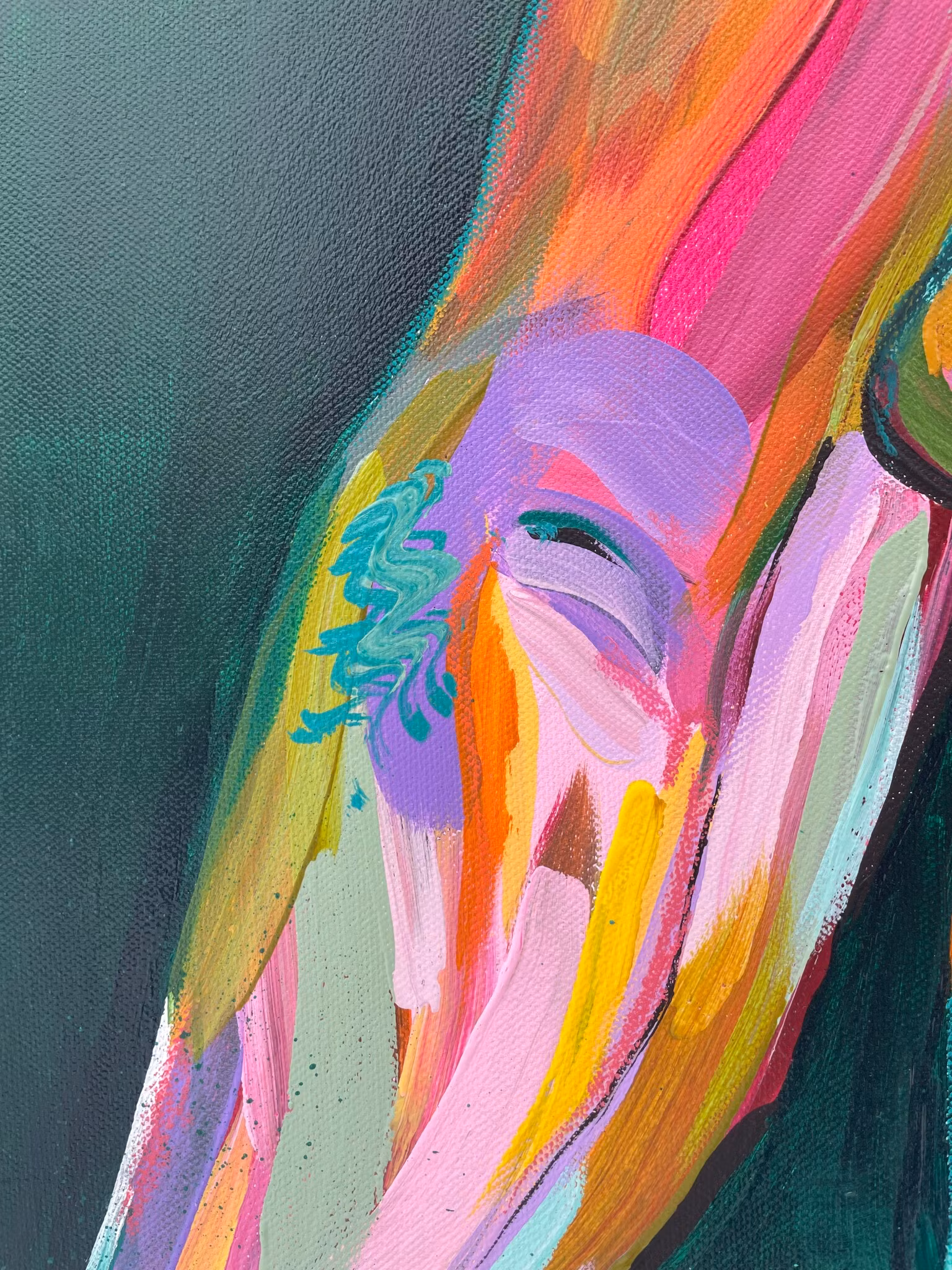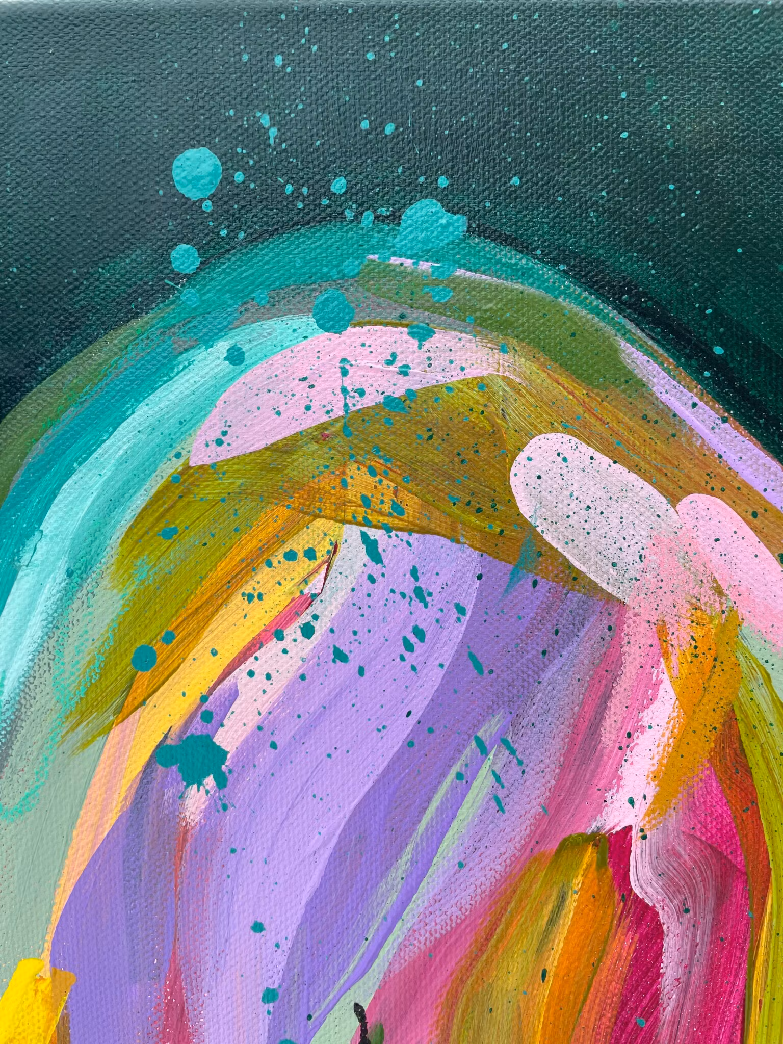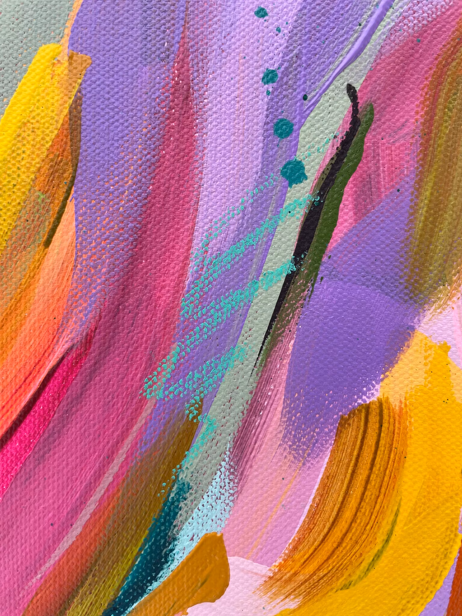 Mörkgrön bas, gult och lila ombesörjes av olika gröna nyanser med detaljer i oljekrita
