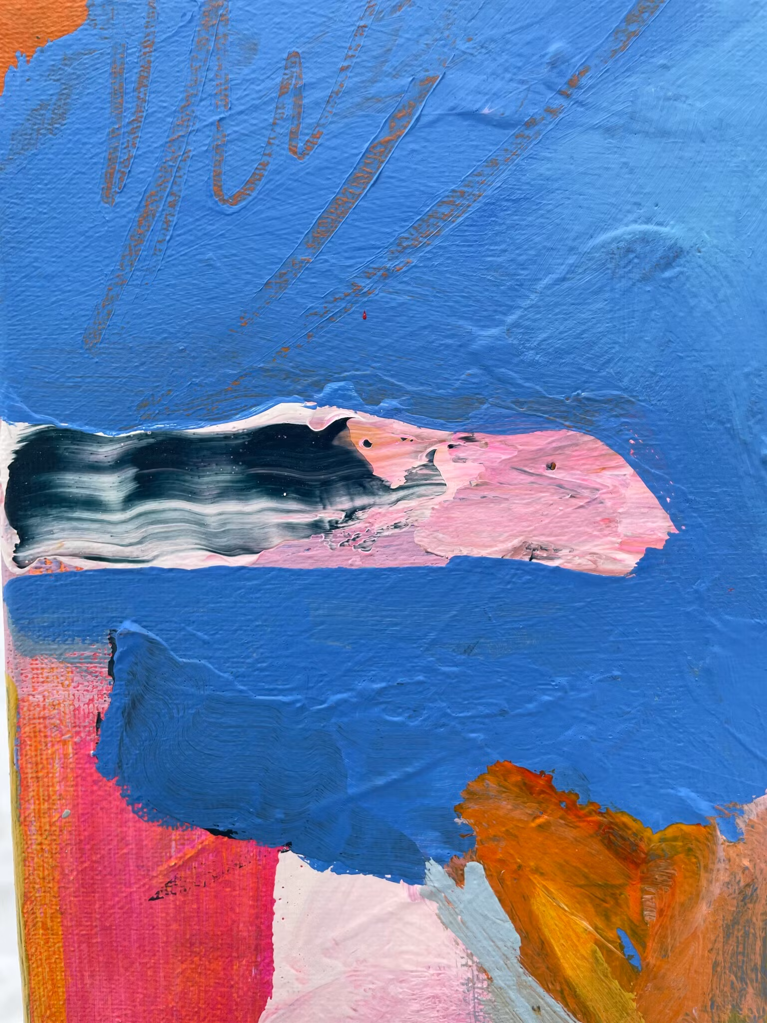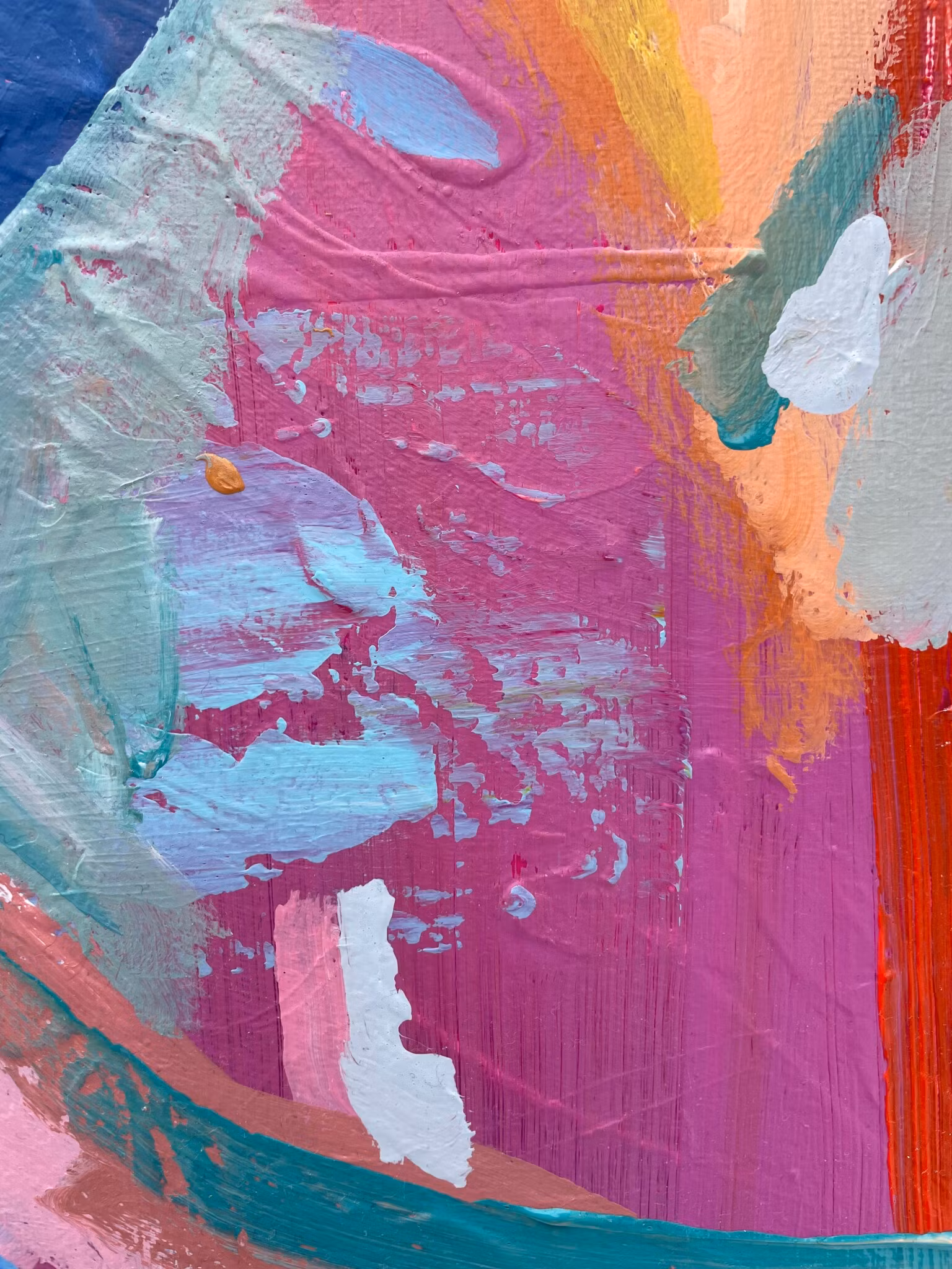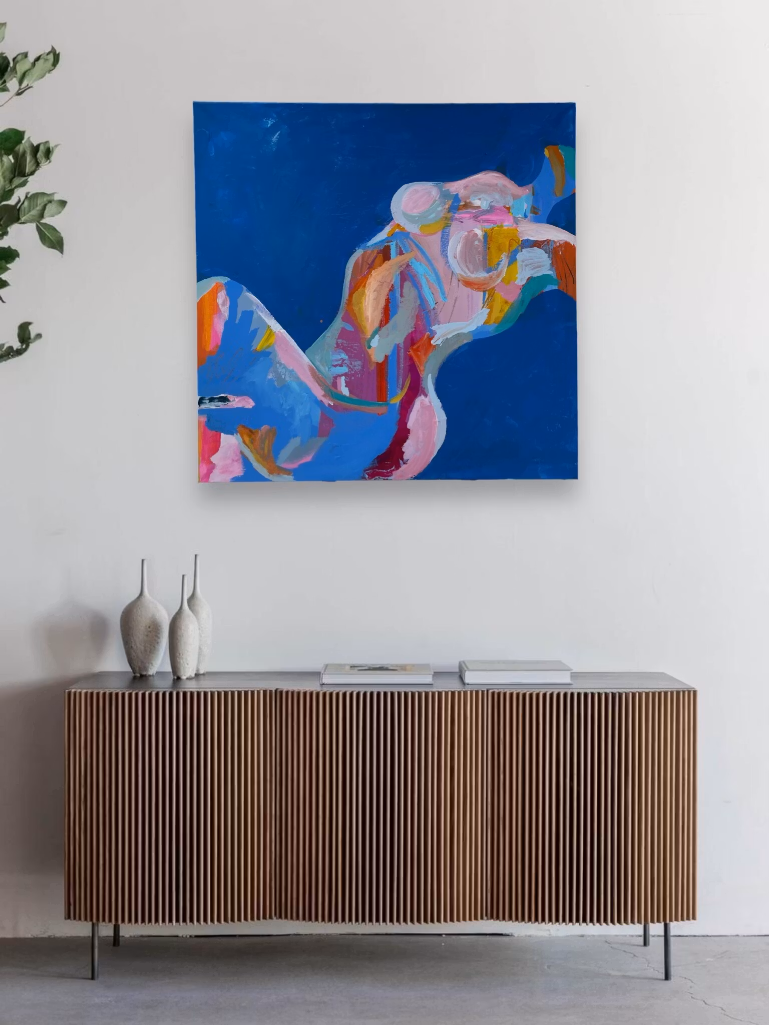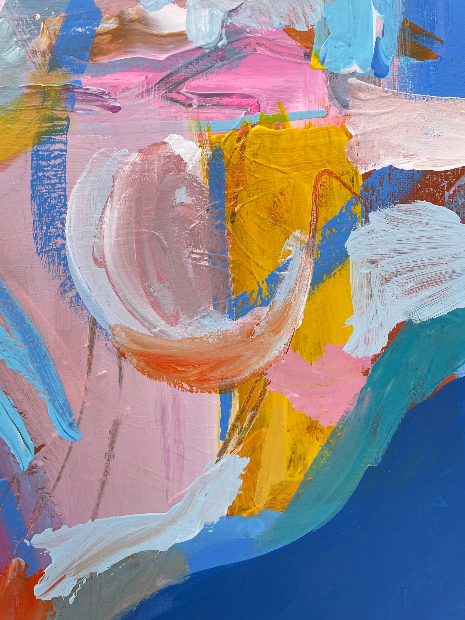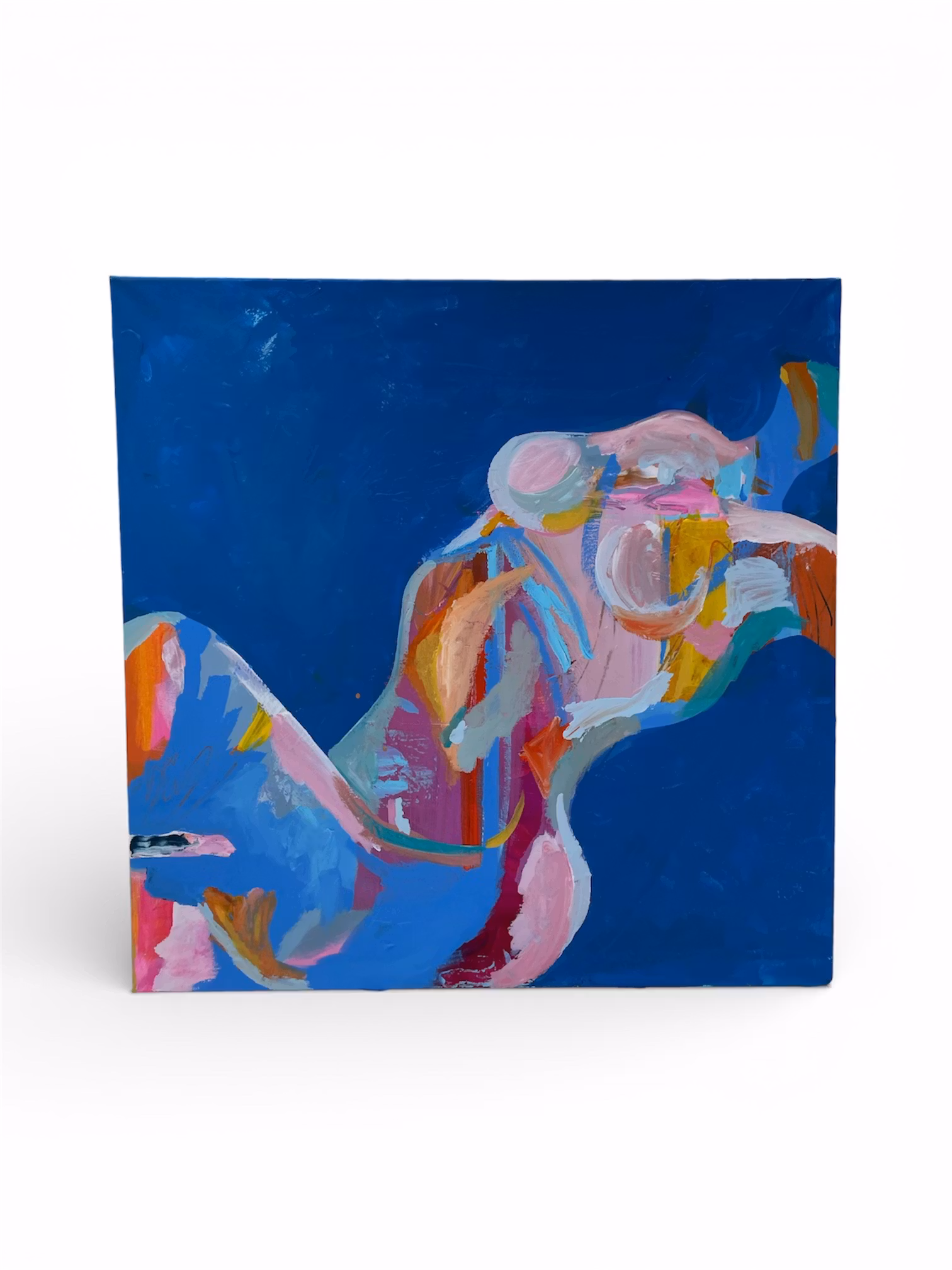En layd back lady som träder fram ur en blå bakgrund. Härliga texturer och märkningar finnes i tavlan, återkommande är nyanser av rosa gul och pastell. 80x80