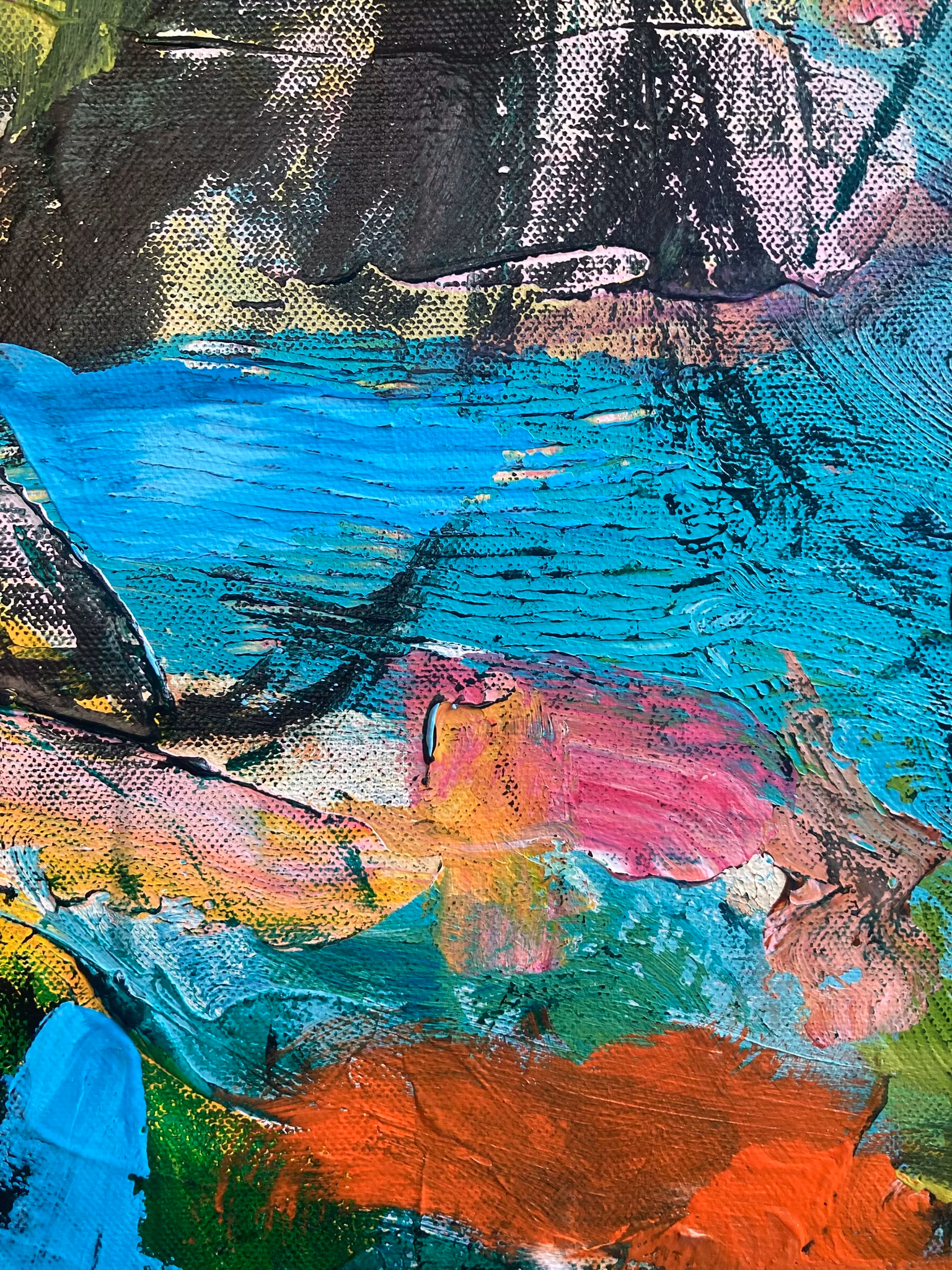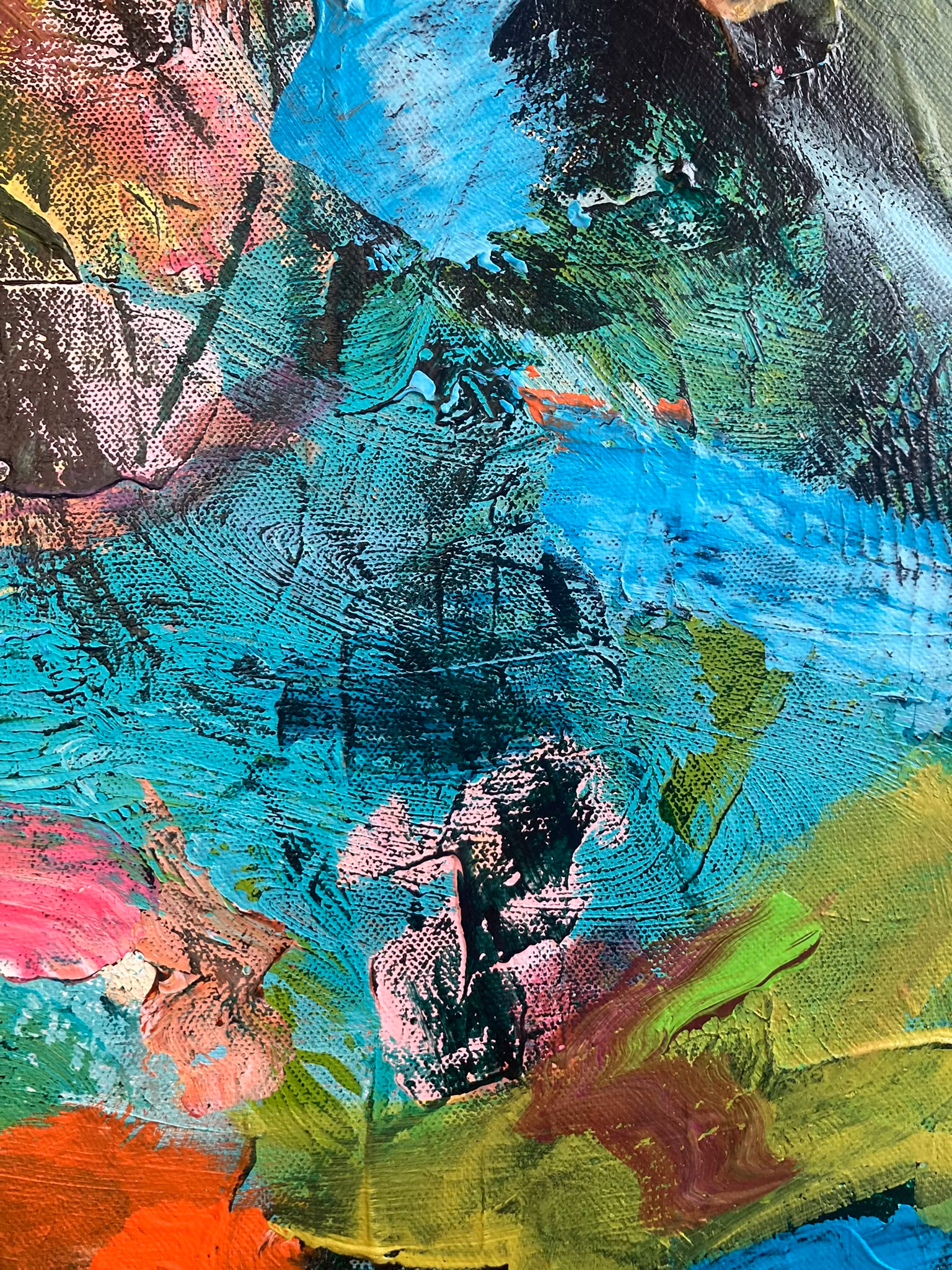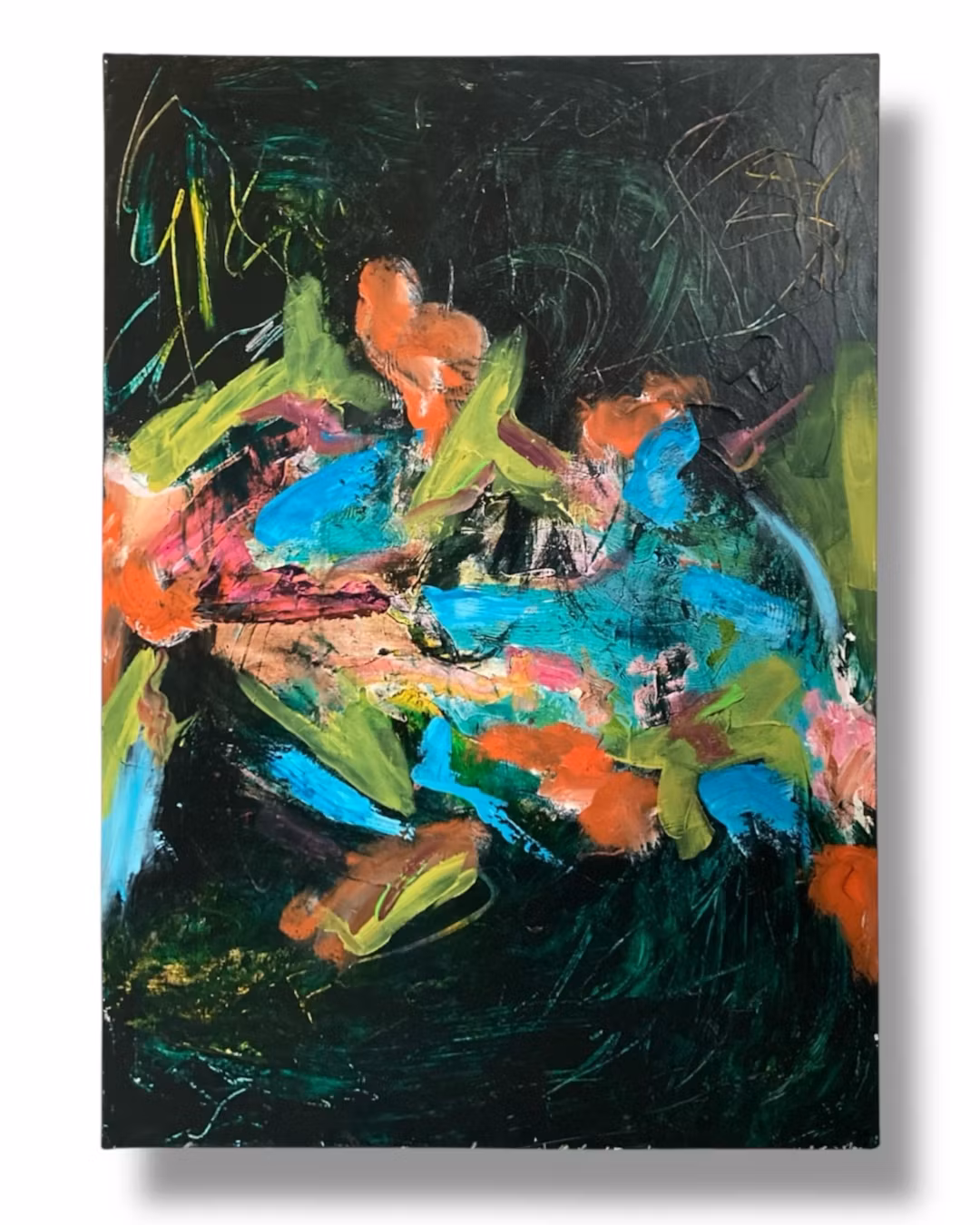 Akryl i mörkgrönt med detaljer av blå, grön, rosa, orange.