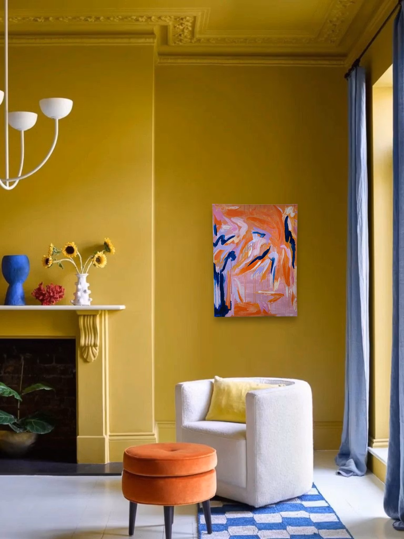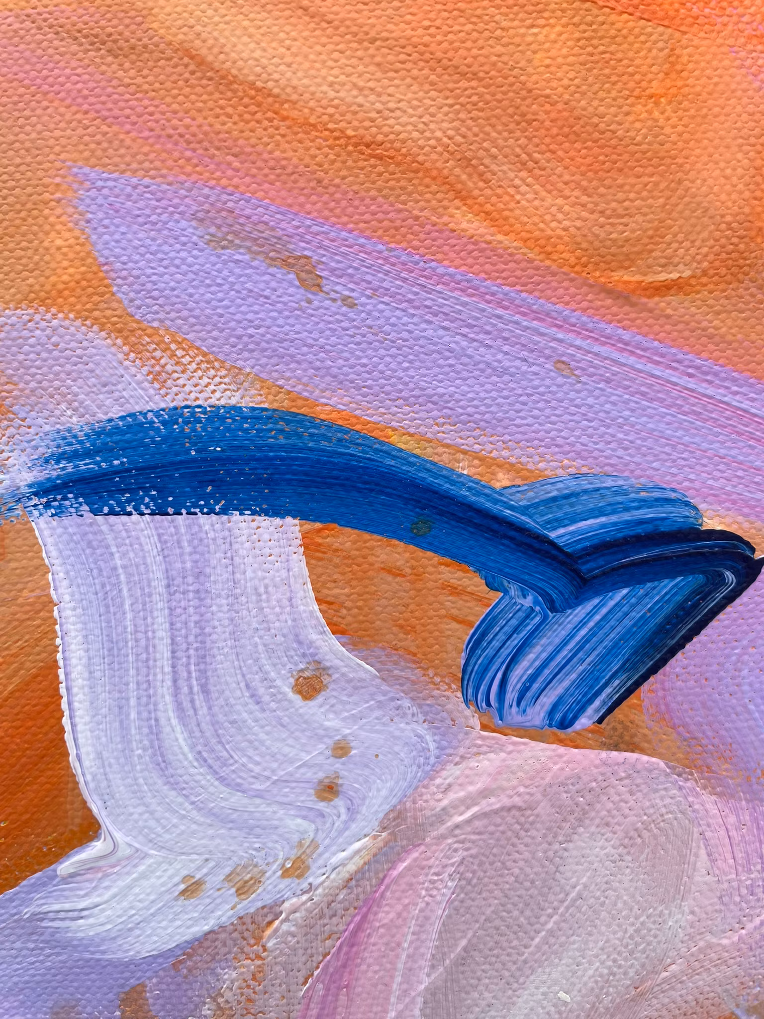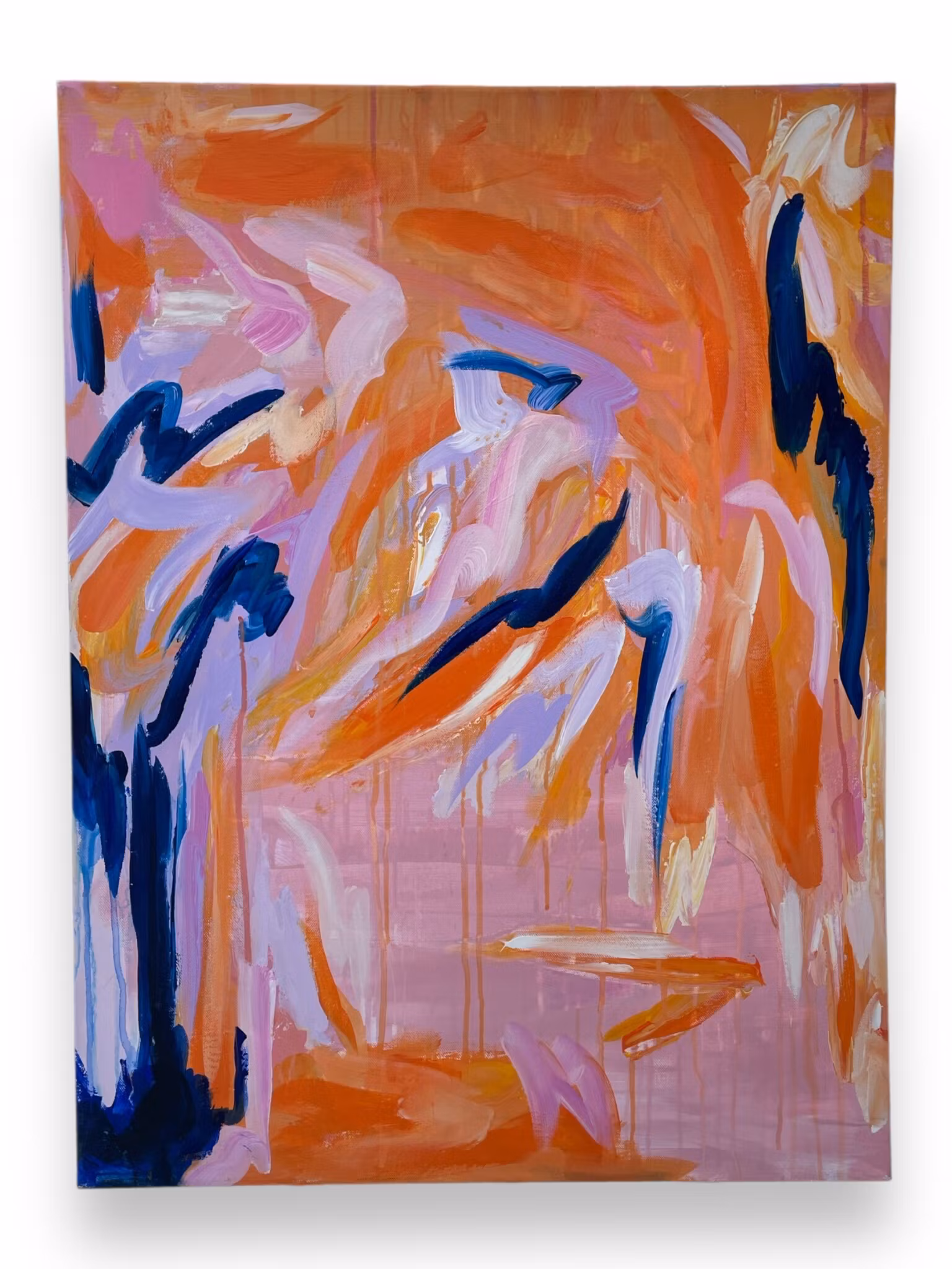 Akryl på canvas, avslutad med detaljer av oljepennor En bas av mauve rosa, detaljer i orange och djupblå.