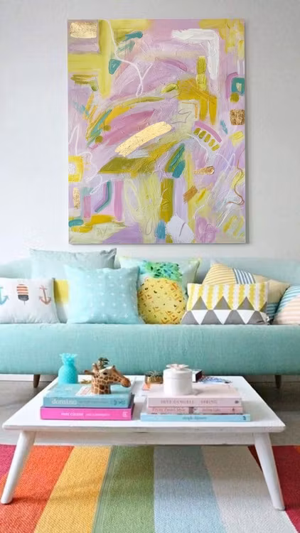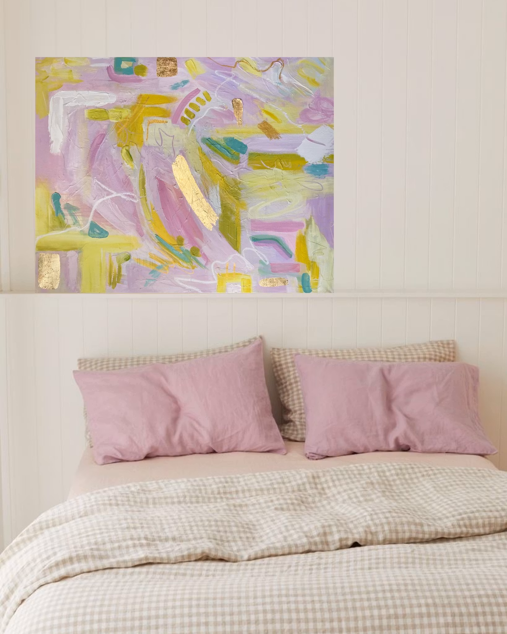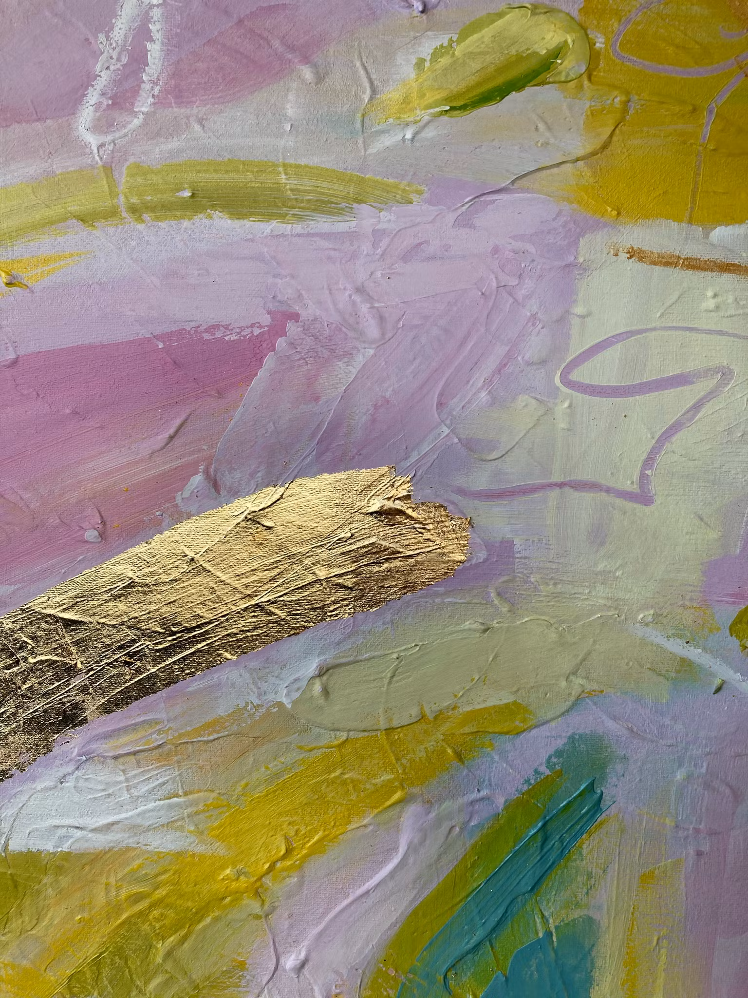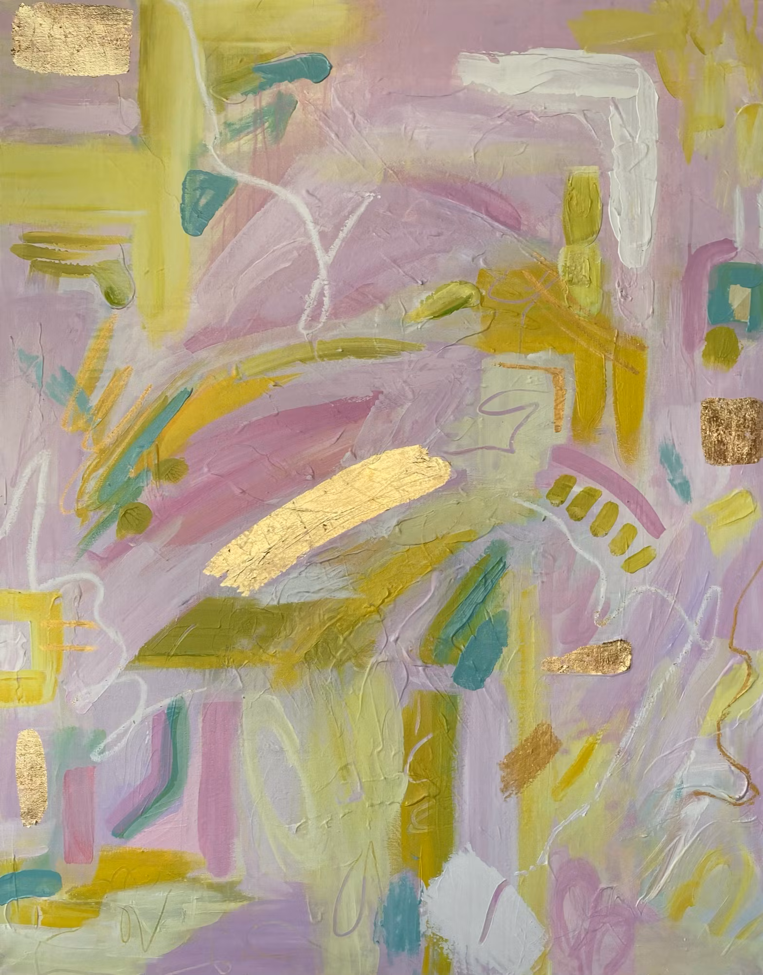 Abstrakt, akryl på canvas, detaljer i guldfolie Likt en soluppgång skiner gulddetaljerna, tavlan matchar en fin sommarbukett. I syren lila och gröna grundande nyanser.