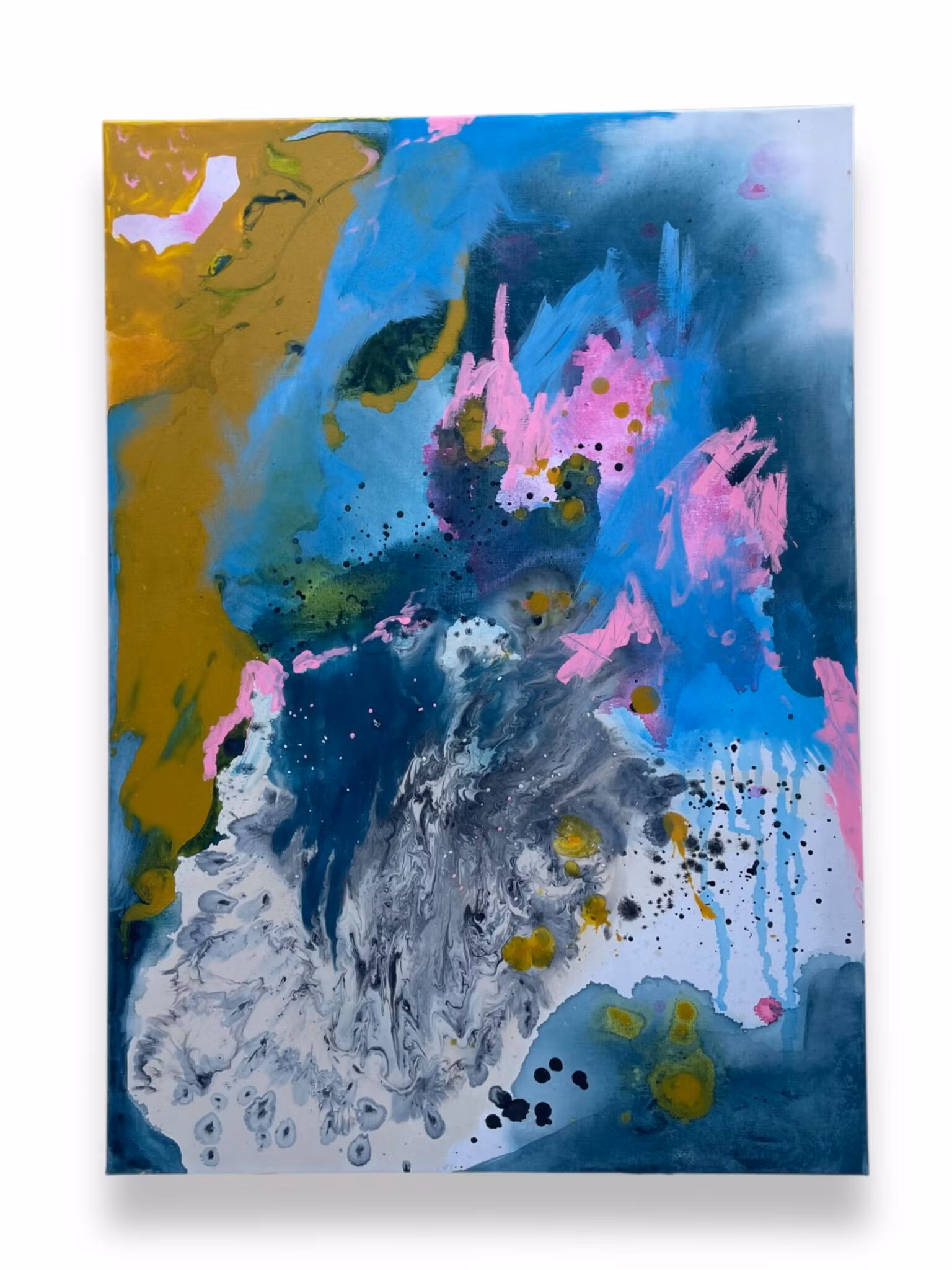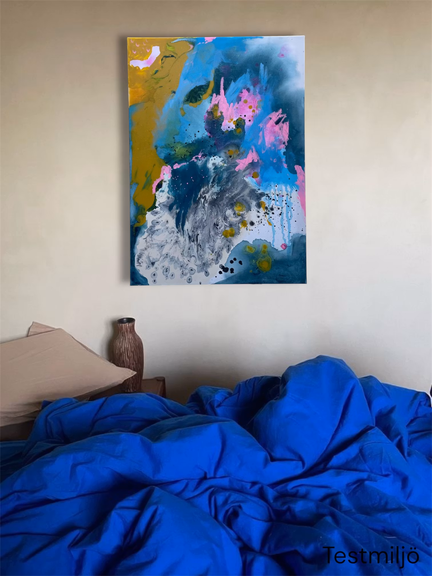 En mix av abstrakt och flytande konst. Likt fyrverkeri blomstrar det ut i resten av tavlan. Bas i blåa nyanser, rosa och senapsgula detaljer med ett fält av beige och prickigt i svart.50x70