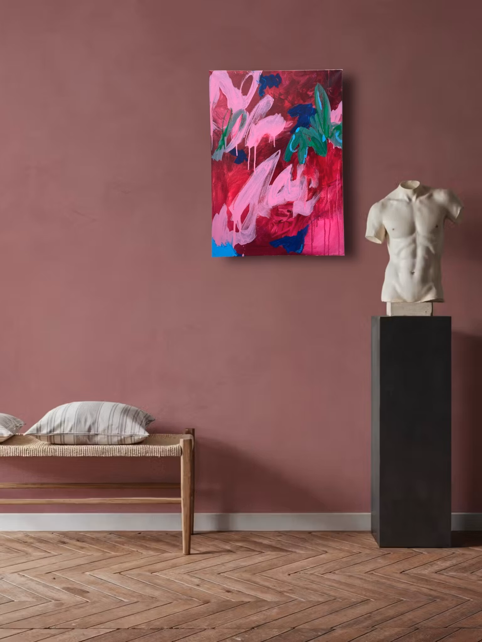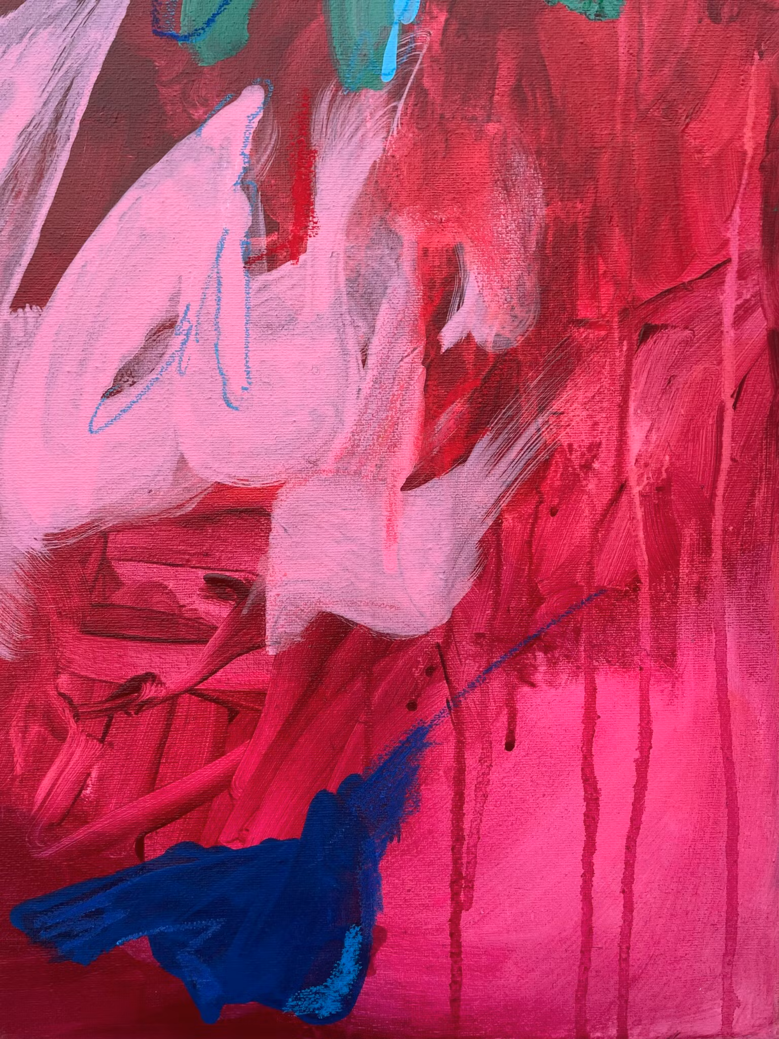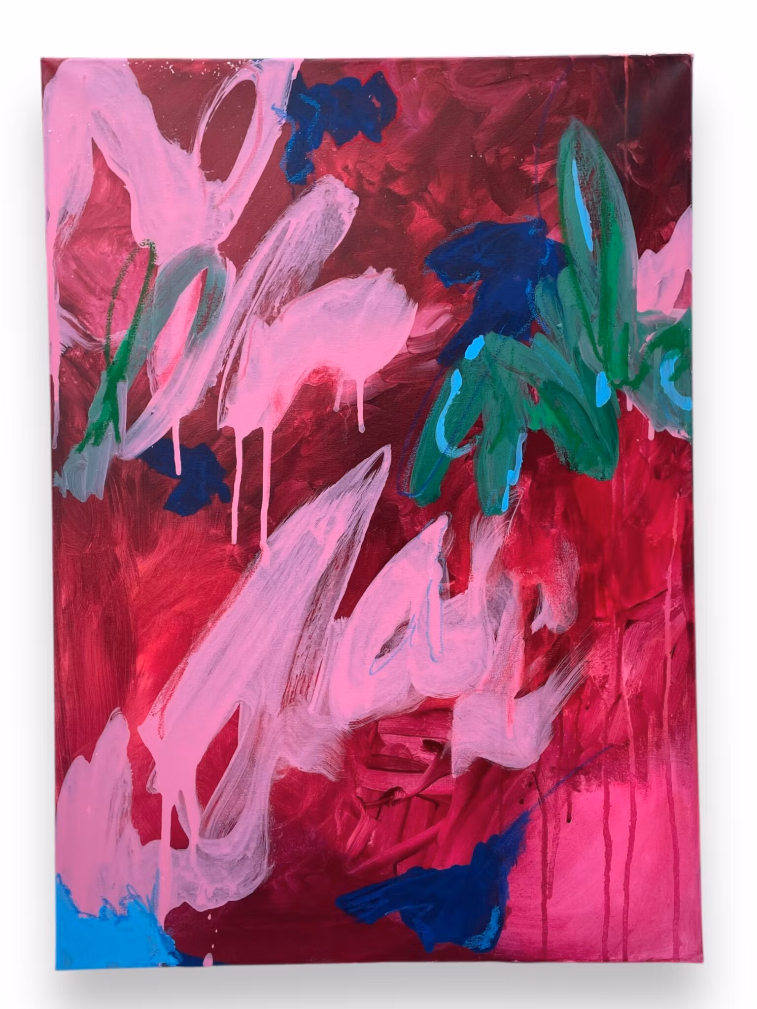En fyllig och härlig mix av röda och rosa toner med detaljer av kungsblå och grön.Abstrakt, akryl på canvas, detaljer av oljekrita.