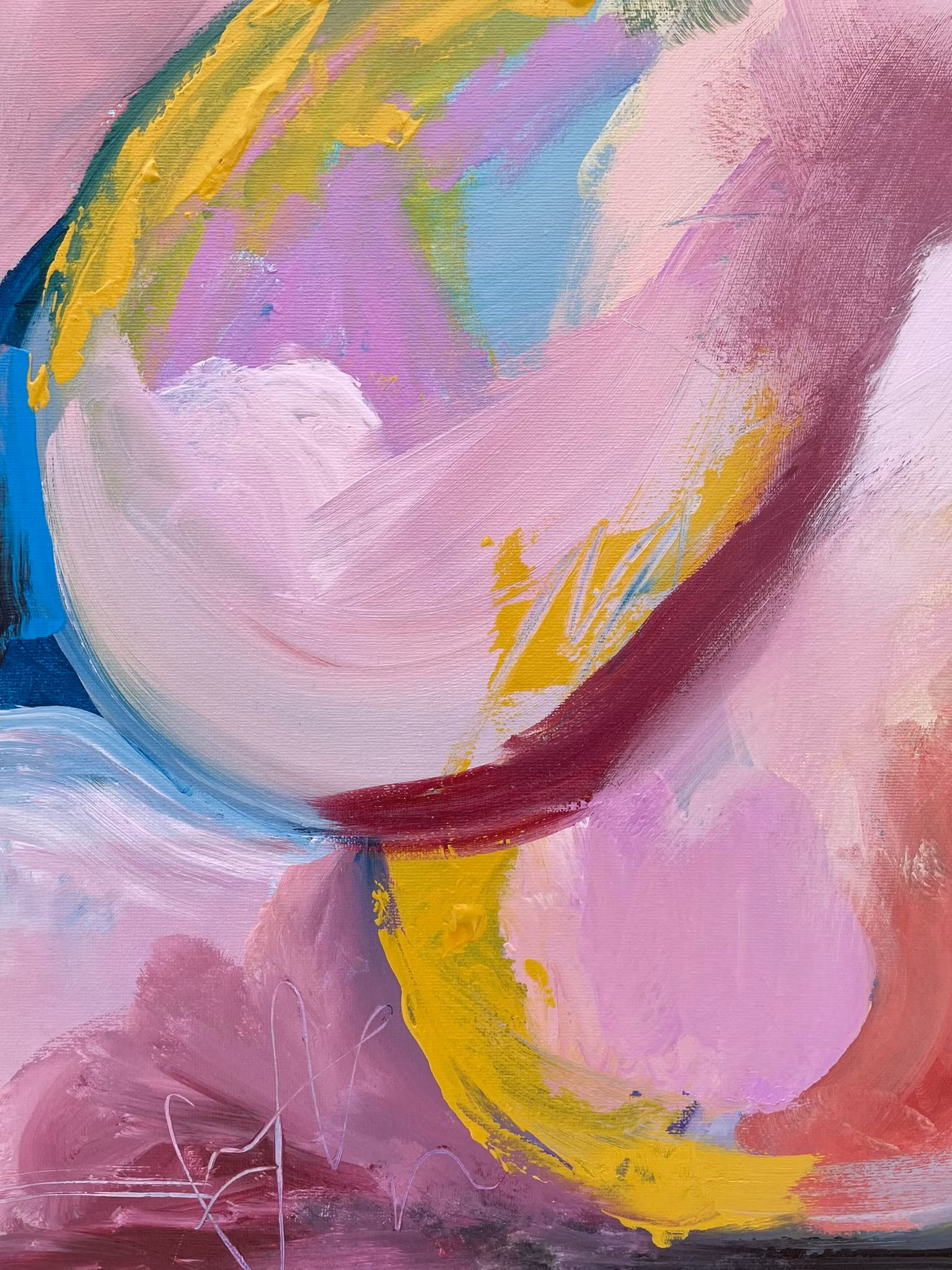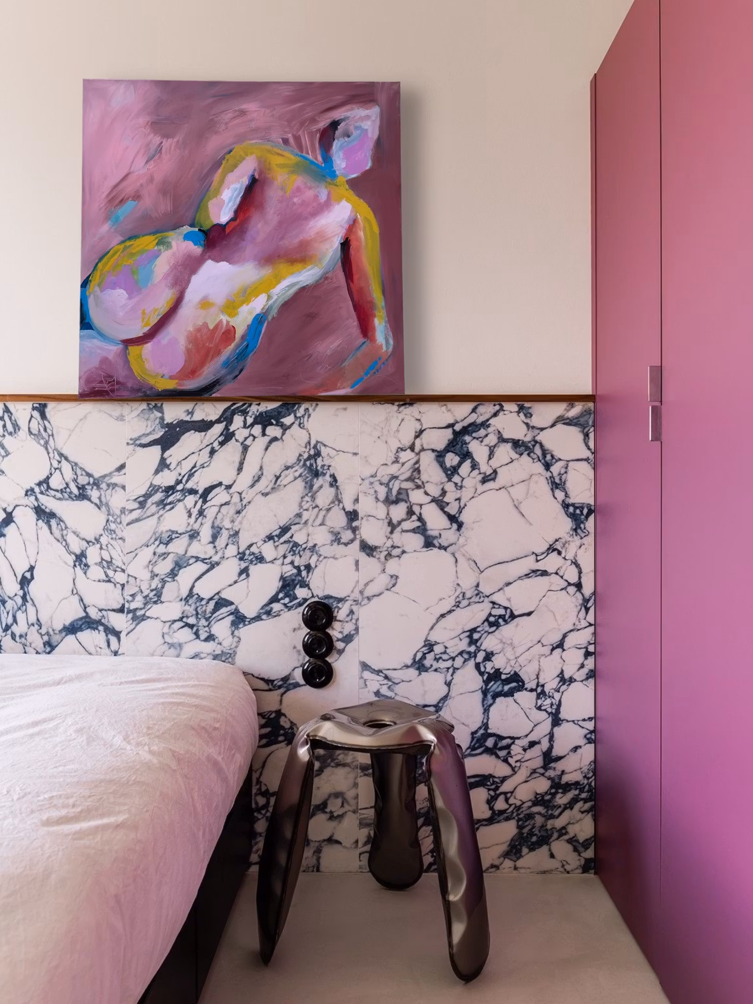 Like one of those french girls. En kropp uppenbarar sig i den lila dimman. Detaljer i gul och blå, inte att förvirra med en patriot. Denna donna poserar som en franssysa. Förföriskt och vågat.