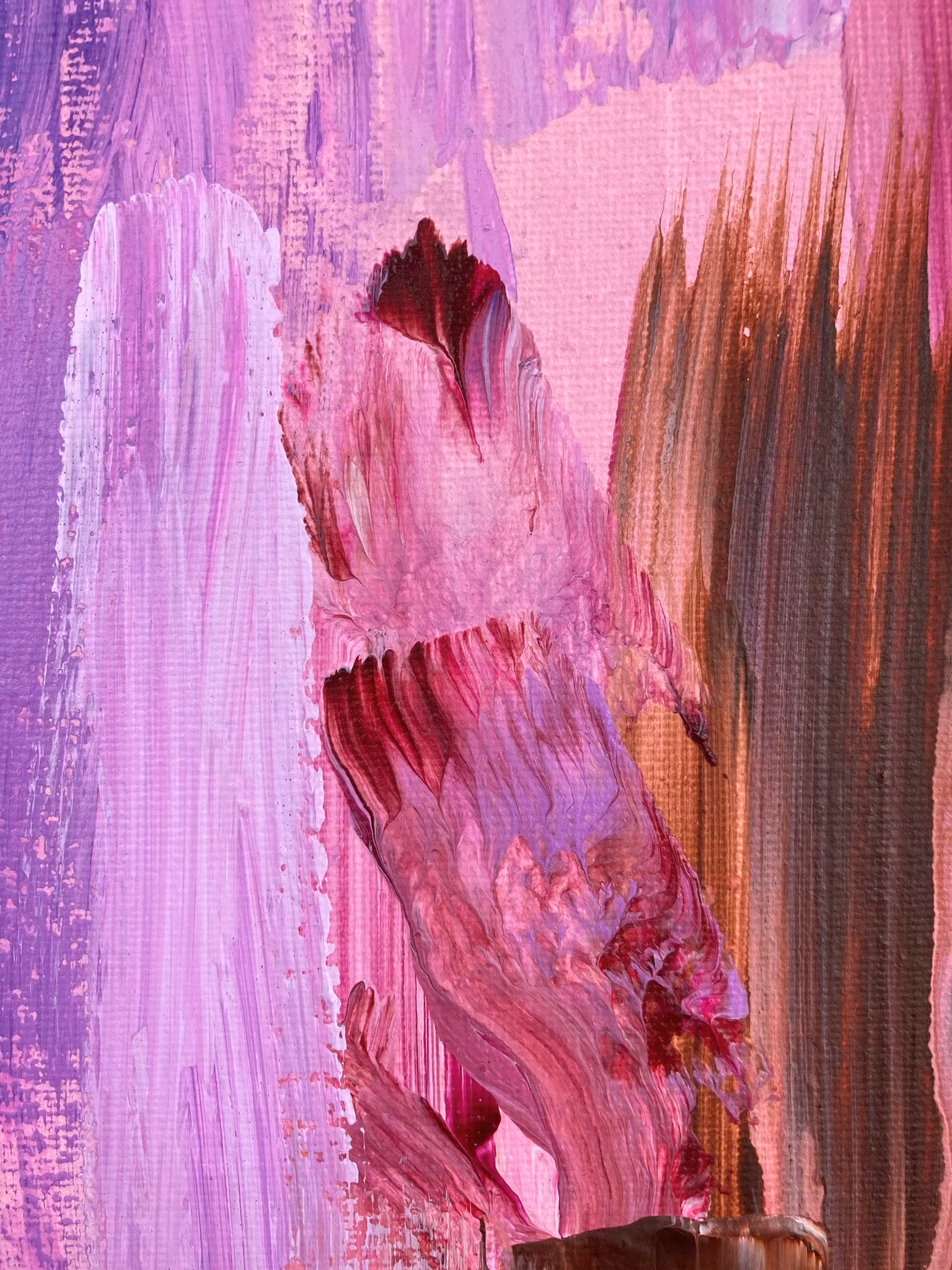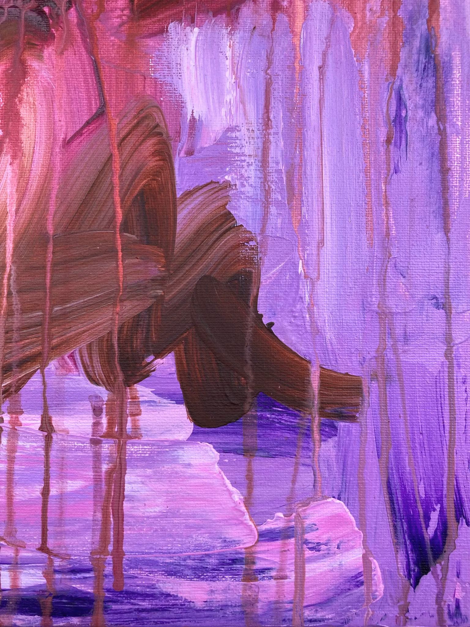 Livfulla nyanser, en mix av varma lilatoner och bruna som lugnar ned tavlan. Skapad i ett flöde med stora rörelser och frihet i färgen där den fått falla fritt.Kall och varm lila samt detaljer i brun och senapsgul.