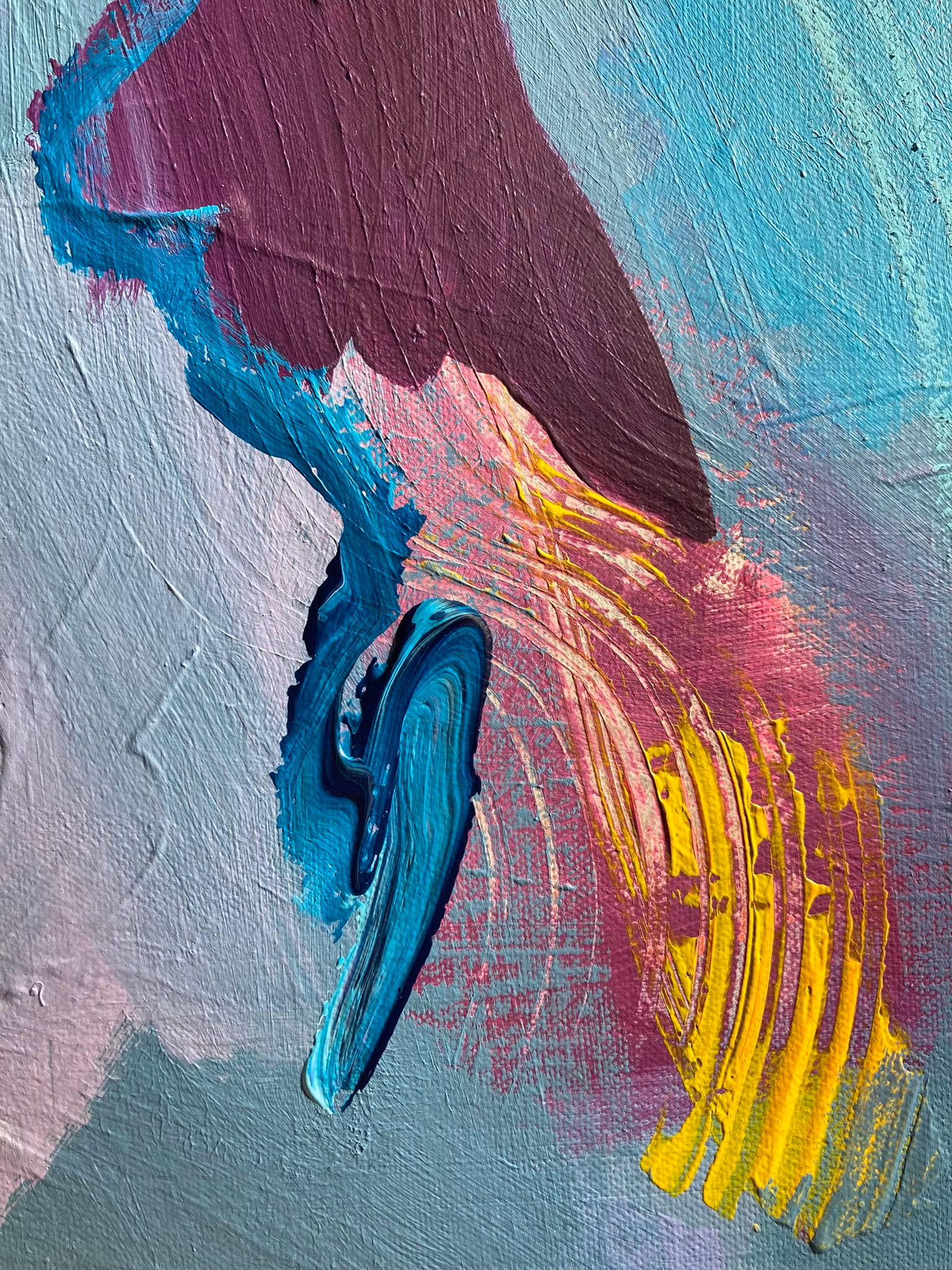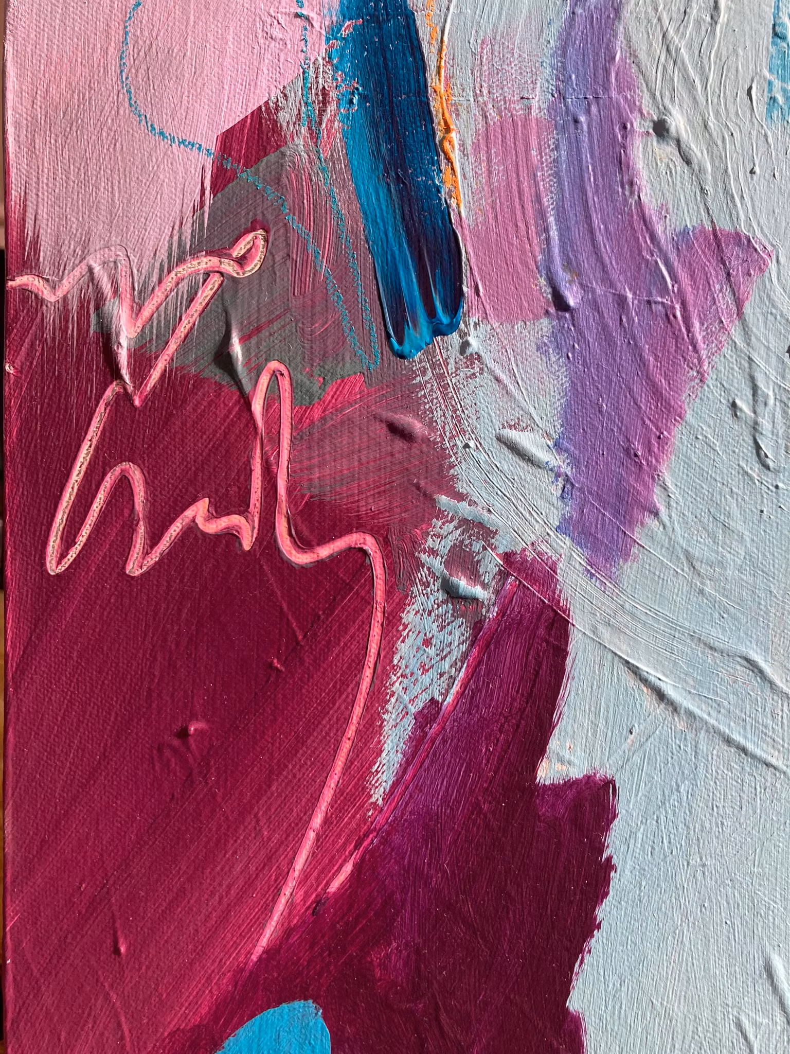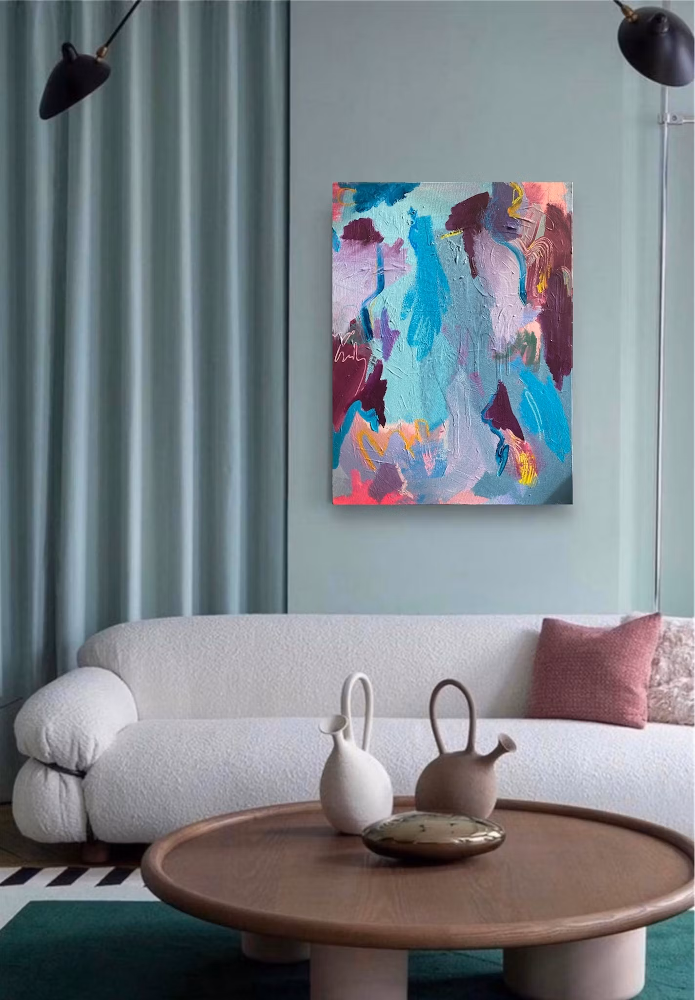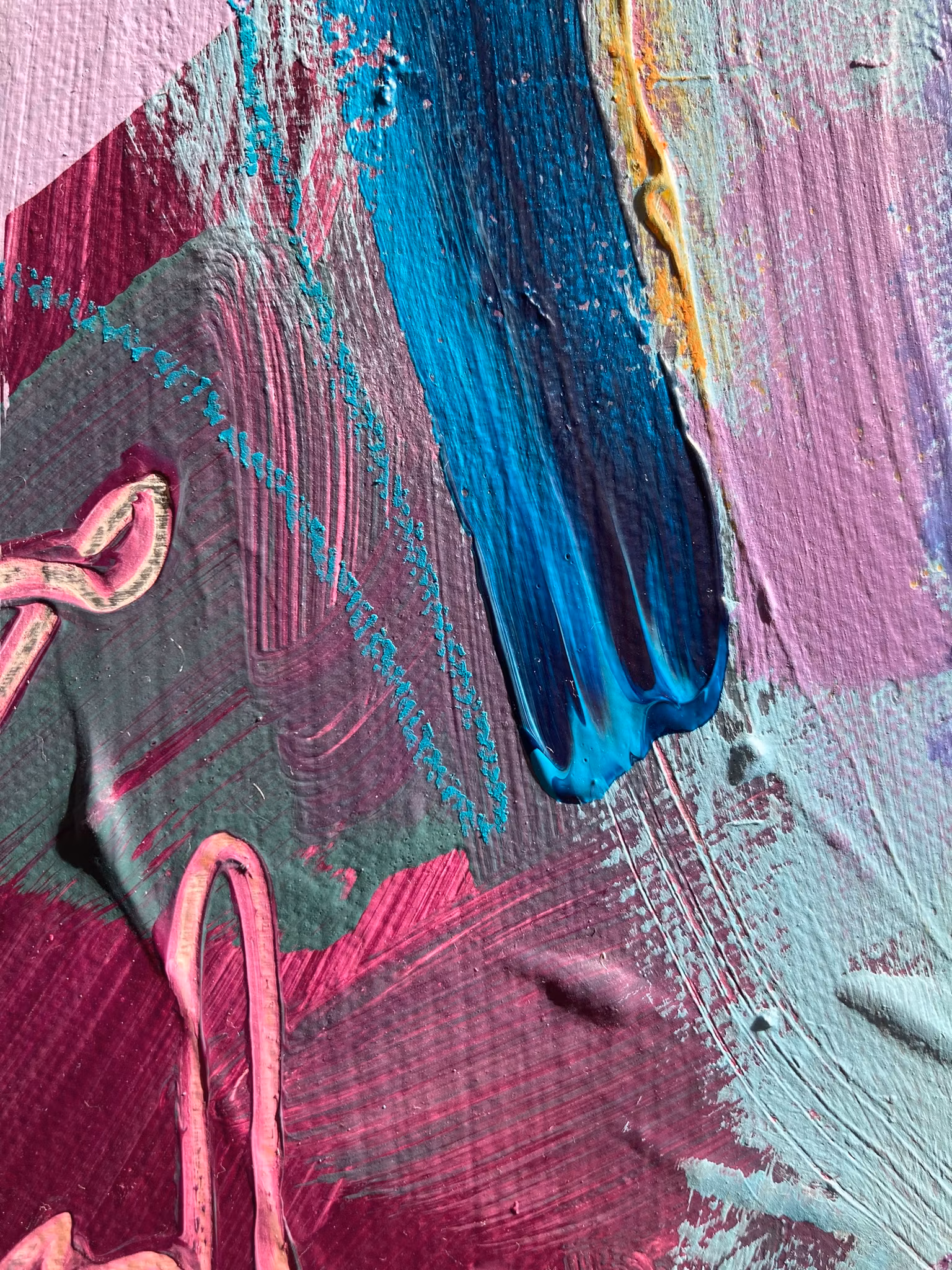 Abstrakt tavla med lugn helhet, stanna upp om se detaljerna i verket bli som små konstverk i sig själva. Genomgående turkos bas samt varierande violetta toner. Detaljer av gult.