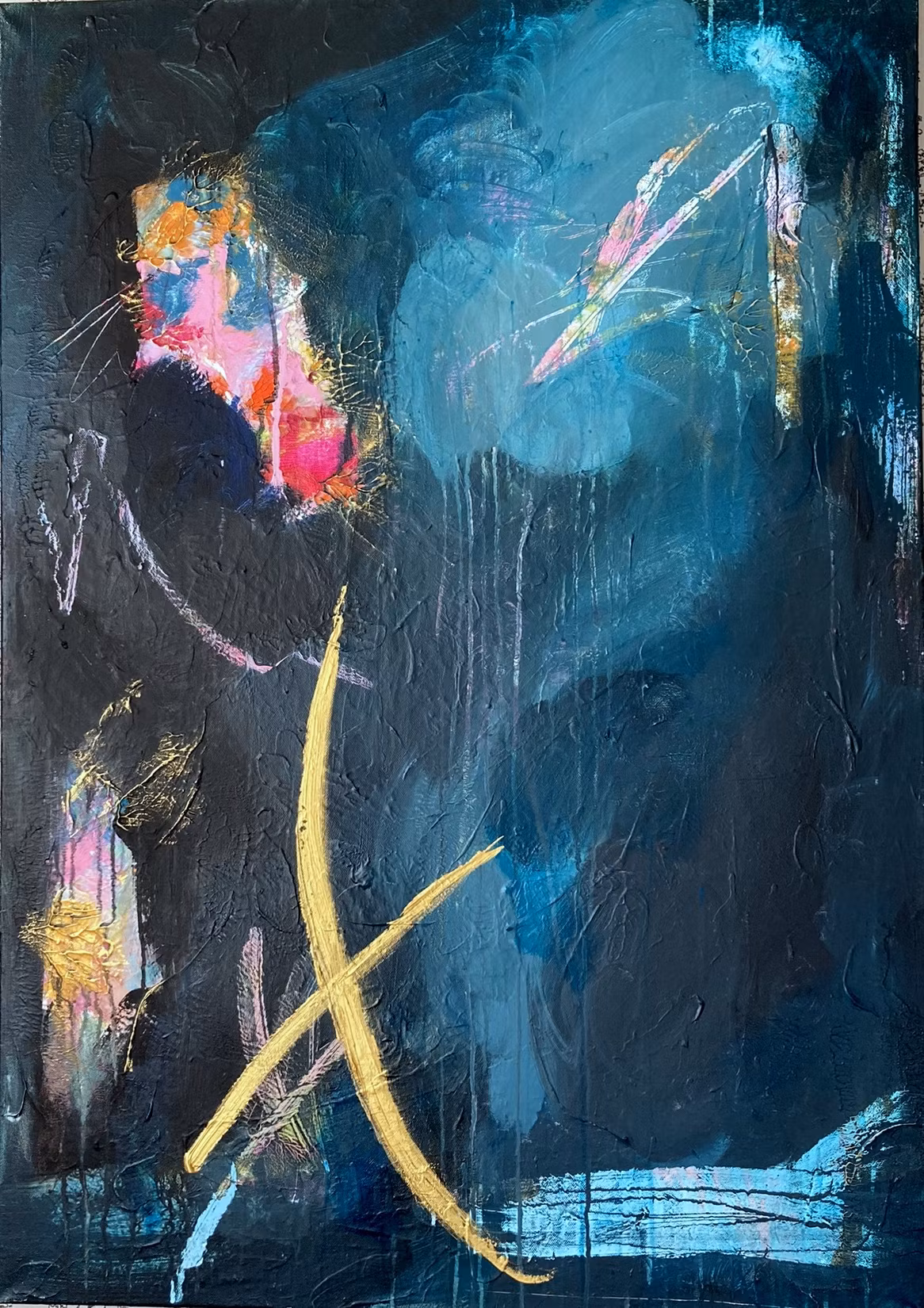 X marks the spot! Färgglad bas med struktur som smyger fram från det övre lagret av mörkturkos. Detaljer av guldig ådring